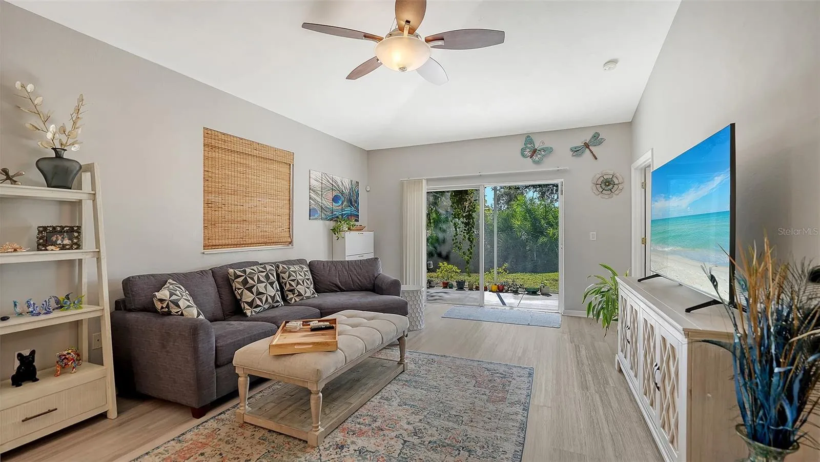 The living room opens gracefully to a recently upgraded and expanded no-see-um screened lanai, offering a serene indoor-outdoor haven perfect for morning coffee, quiet afternoons, or unwinding under evening skies. This exclusive standalone design allows sunlight to pour in from multiple angles—far more than a traditional paired villa—creating a bright, uplifting environment rarely found in this community.
