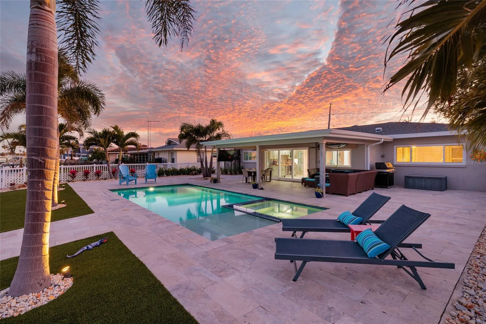 The centerpiece of the home is the outdoor living space featuring the new 30′ x 15′ gunite saltwater pool with heated/chilled controls, and an integrated hot tub surrounded by travertine tile. The pool area feels like you are on vacation with a soaking deck, mature tropical landscaping, and premium artificial turf, delivering resort-style ambience and effortless maintenance. If you live here you will not want to leave. The garage space was redesigned to bring the laundry facilities inside while adding a stunning new third bathroom. Currently, garage is ideal for one car and your golf cart! Paradise living can be yours.