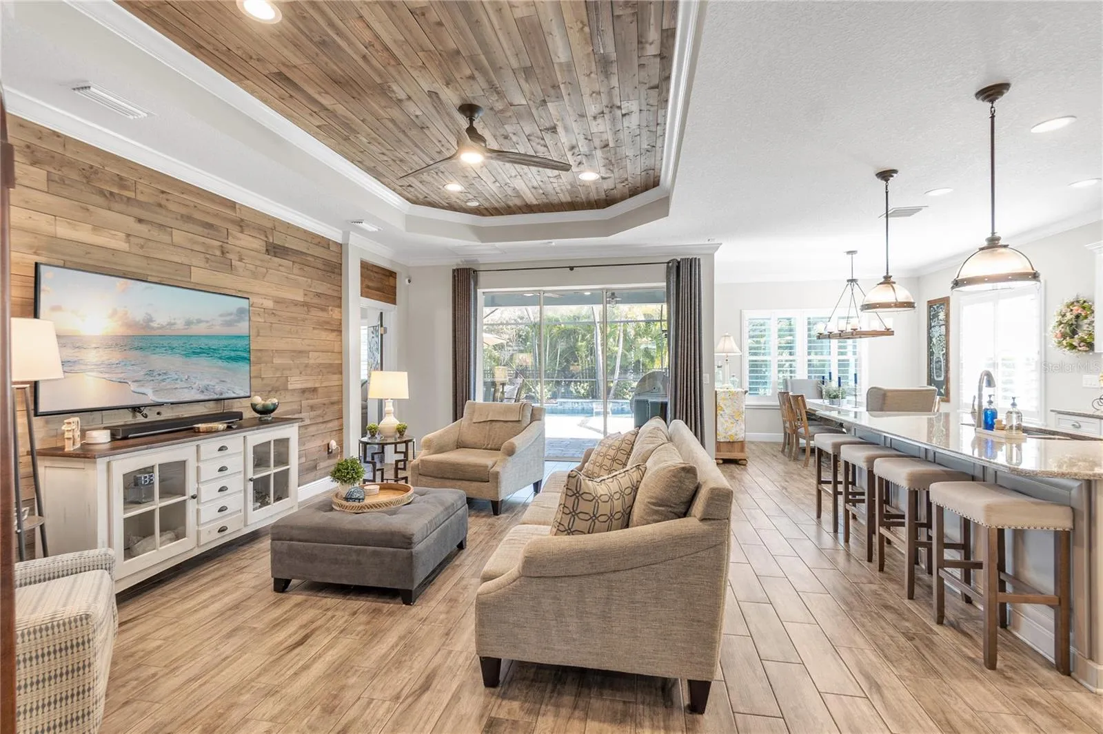 STUNNING HOME IN DESIRABLE WATERSET!! This immaculate triple-split floor plan features 3 bedrooms, 3 full baths, plus a den, and showcases unparalleled elegance, better than a model! The home offers an open layout with beautiful porcelain wood-look tile flooring throughout and coffered ceilings with wood in-lay in the foyer, living room, and primary bedroom, enhanced by custom shiplap accents in key areas.
