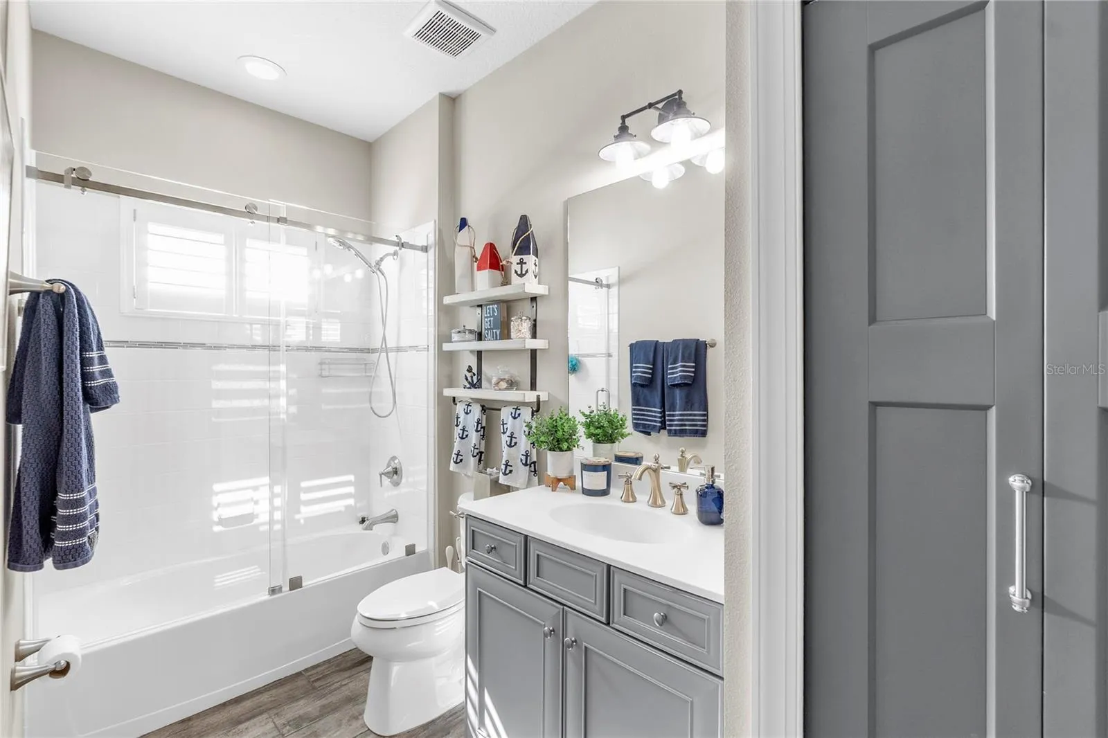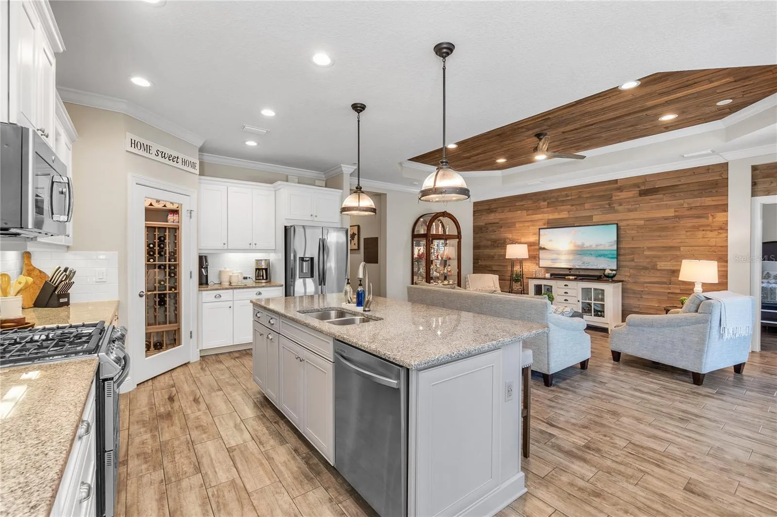 The kitchen is a chef’s dream, equipped with upgraded appliances, two-tone cabinets, granite countertops, and a walk-in pantry featuring an upgraded glass door. Convenient USB outlets are installed in both the kitchen and master bedroom. Custom California Closets can be found in every closet, including the pantry, and a stylish barn door provides access to the primary bath, which boasts a double vanity with custom lighted mirrors.