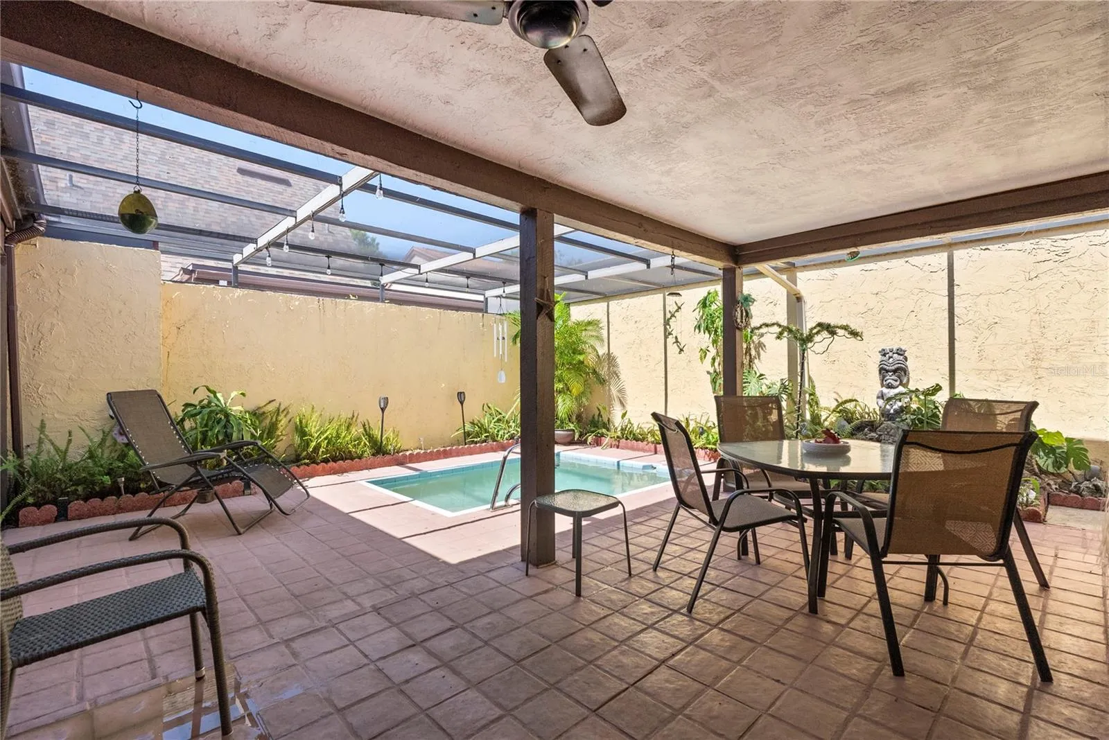 Welcome to this wonderful 2 bedroom 2 bathroom 2 car garage patio home in the desirable community of Beacon Woods. This patio home is one of the only with a pool! Entering the home through the security gate to the side entry door, you enter the double doors into the family room and dining area combination. You will notice the cathedral ceilings and updated laminate floors. There are sliders to a an enclosed outdoor space that is currently being used for a garden and pond. The kitchen has been updated with cabinetry, fixtures and exotic granite countertops. There is a secondary family room that many have converted into a 3rd bedroom. The primary suite has its own bath and a set of sliders to the back patio and pool area. On the other side of the home is the second bedroom and guest bathroom. As past of Beacon Woods, you can use the clubhouse, tennis and pickleball courts, enjoy the heated community swimming pool and all the events, activities and social calendar offered. Located about 10 minutes from SunWest Beach, local Gulf restaurants, shopping both grocery and retail and approx 45 minutes from Tampa International Airport.