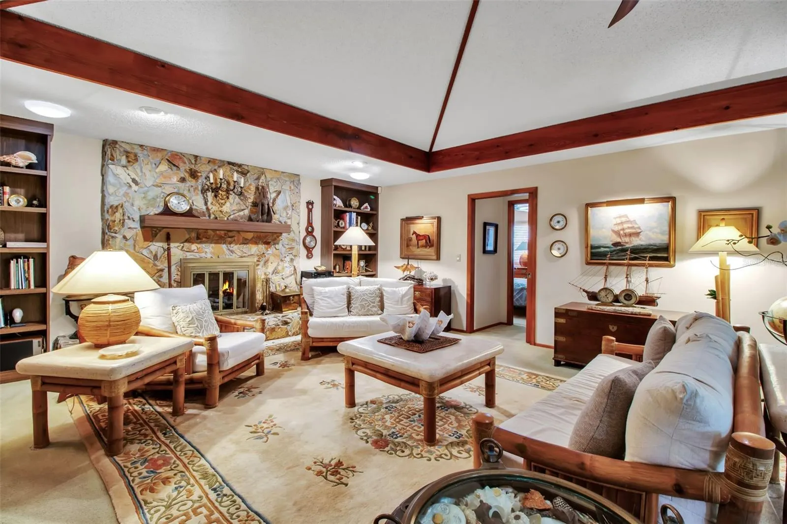 The split floor plan offers privacy and functionality, with an open-concept living area that includes vaulted ceilings and a fireplace. The kitchen features granite countertops, a serving window to the lanai, and flows seamlessly into the main living space, making it ideal for everyday living and entertaining.