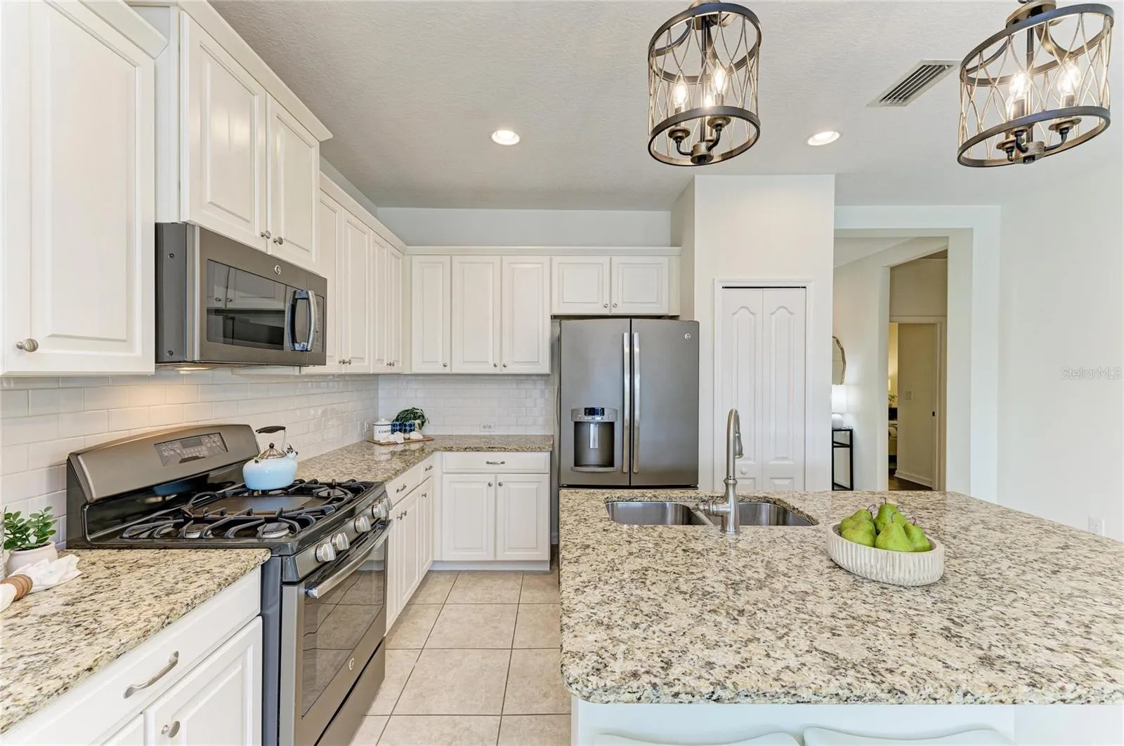 An exceptional opportunity to own a QUICK MOVE-IN, LAKEFRONT villa, where waterfront premium homes are rarely available. Located in the gated Fairfield community by Neal Communities, this beautifully maintained residence offers resort-style amenities including a pool, recreation center, and fitness facility just moments away. A charming covered front porch sets the tone, while the extended screened lanai captures tranquil lake views and features a gas hookup, perfect for grilling, morning coffee, or evening unwinding. Inside, the bright, open floor plan showcases tile flooring, volume ceilings, and a tray-ceiling living area enhanced by recessed lighting, a ceiling fan, and three glass sliders that blur the line between indoor and outdoor living. The kitchen offers granite countertops, a large center island with stylish pendant lighting, double-basin sink, and GE slate fingerprint-resistant appliances, including a gas range and newer dishwasher (2023), plus dining area has a new chandelier (2026). The primary suite is a peaceful retreat offering lake views, laminate flooring, a ceiling fan, dual closets, and an en-suite bath with dual vanities and a walk-in shower. A comfortable guest bedroom offers privacy towards the front of the home, laminate flooring and a walk-in closet, while the den/office, also with Engineered hardwood flooring, provides flexible space for work or relaxation. Additional features include a Culligan water softener, newer HVAC (2024), fully refreshed with all new interior paint (2026), an interior laundry room with upper storage cabinets, and front loader washer and dryer on storage pedestals are included. The 2-car garage has an overhead storage rack and built-in upper cabinets for your storage needs, and hurricane panels for all openings for added peace of mind. With a low HOA fee, no CDD fee, and maintenance assisted grounds included, this residence is ideal as a full-time home or an effortless Florida retreat. Perfectly situated just west of I-75 and south of downtown Bradenton, you’re minutes from shopping, dining, parks, golf courses, the Braden River Library, and the Gulf beaches. Offering the space and comfort of a single-family home, this twin villa features one of the largest floor plans in the community.