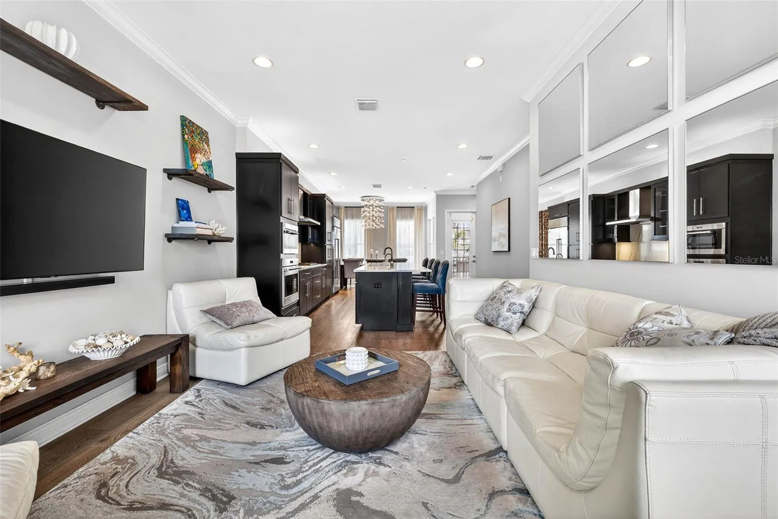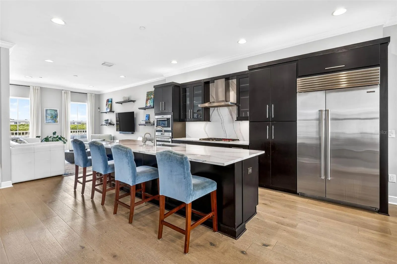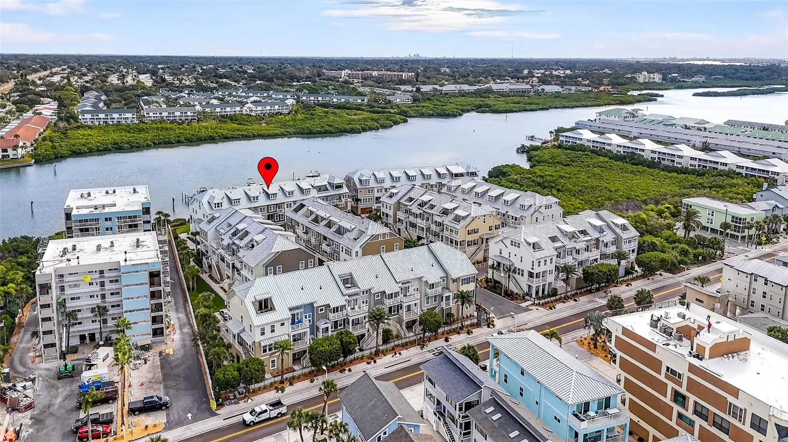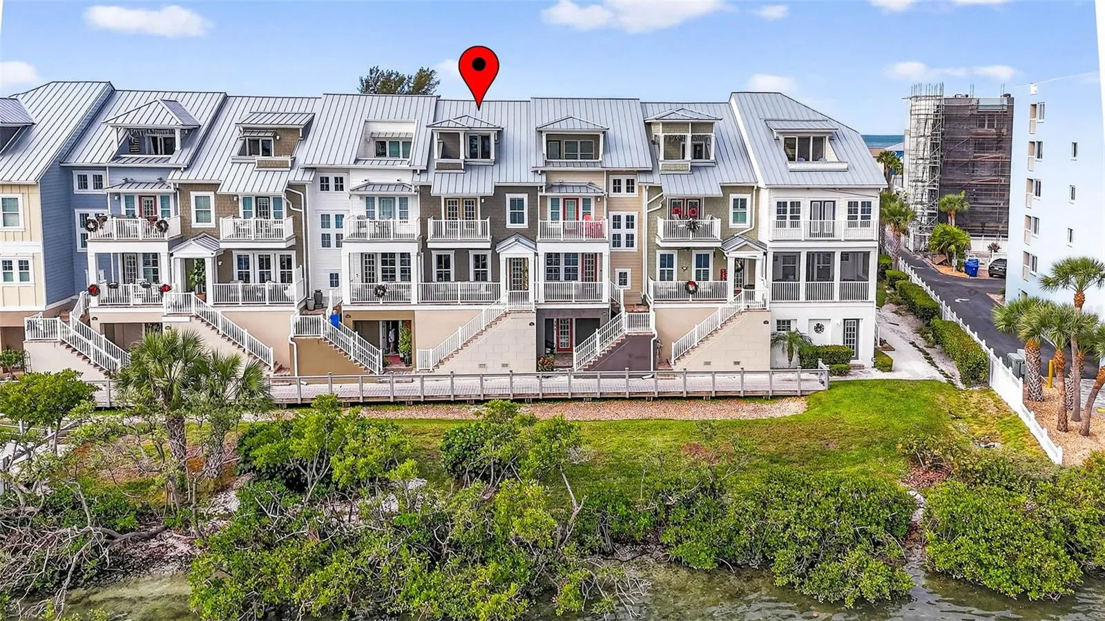 Experience refined coastal living in this beautifully appointed four-story waterfront townhome in Indian Shores, offering one of the finest views in the community. Just steps from the beach and the private community dock, this light-filled residence showcases sparkling water views on every level, wood flooring, crown molding, high ceilings, impact-rated windows and doors, and a private elevator servicing all floors. The designer kitchen overlooks the living and dining areas, creating an elegant space for entertaining. Custom cabinetry, high-end fixtures, a Sub-Zero refrigerator, premium Wolf range, gas cooking, instant hot-water tap, and abundant storage complete this true chef’s kitchen. This level also includes a stylish powder room. Balconies on each floor capture unobstructed vistas of the Intracoastal Waterway. The third floor hosts the primary suite with two generous walk-in closets—one currently used as an office—along with a luxurious en-suite bath featuring dual sinks and an oversized shower. A private balcony extends from the primary suite. A secondary bedroom with its own en-suite bath and custom built-ins, along with a conveniently located laundry room, complete this level. The fourth floor offers a versatile third bedroom or flex space—ideal as an office, library, or fitness room—featuring its own en-suite bath and the home’s most secluded balcony. The newly painted garage accommodates three cars with ample additional storage. Recent upgrades include a new water softener and whole-house filtration system. With breathtaking 180-degree water views, a community boat slip, a heated pool, and effortless access to the white-sand beaches of Indian Shores, this exceptional home embodies the very best of luxury coastal living.