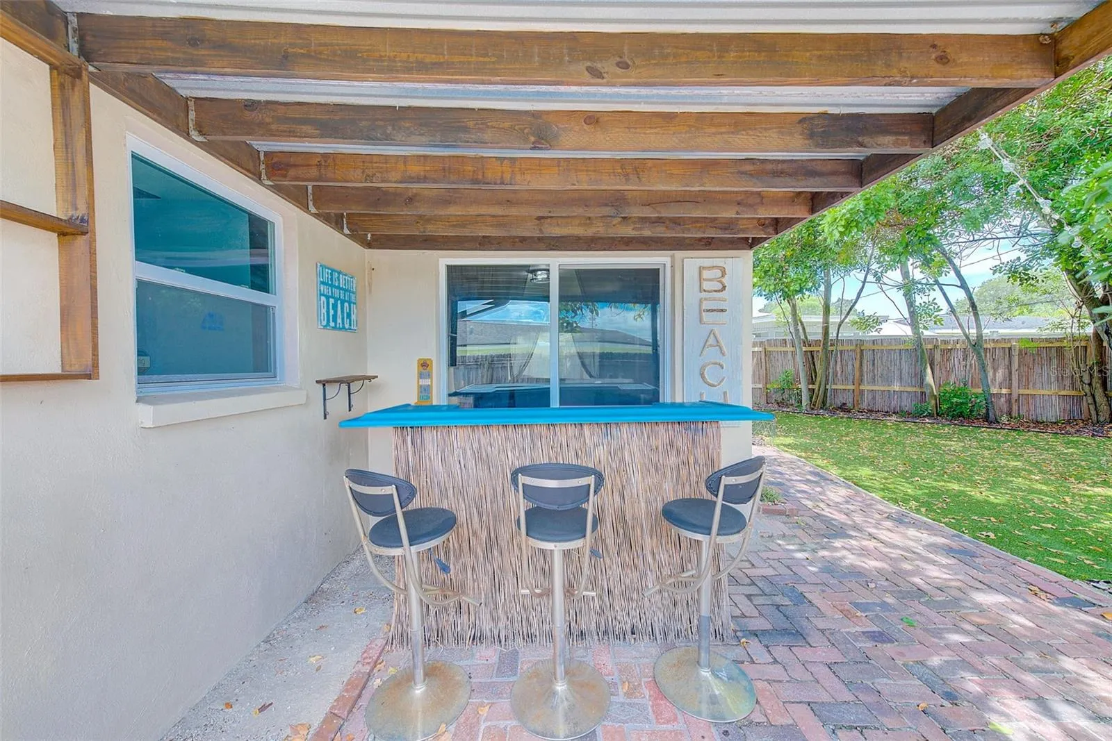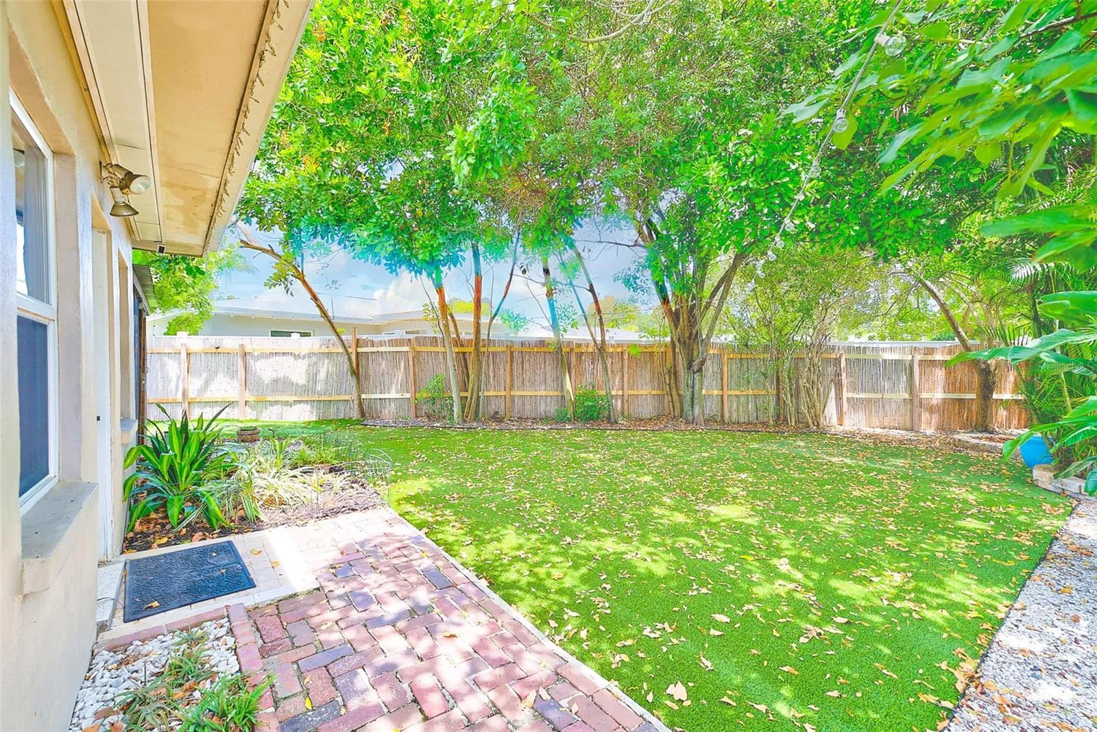 Outside, escape to your own private sanctuary—a stunning backyard oasis complete with a deck, patio, screened-in lanai, mature trees, completely astro-turfed yard, and dedicated bamboo bar area surrounded by a bamboo fence for privacy. Perfect for entertaining and simply enjoying Florida’s outdoor lifestyle.