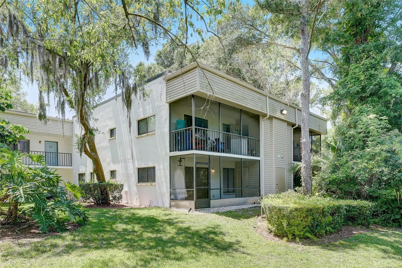 One or more photo(s) has been virtually staged. Beautifully UPDATED 2 bedroom, 2 bath, FIRST-FLOOR, CORNER UNIT with serene conservation views nestled under the oaks in the desirable Fox Chase condo community. Spacious and modern open floorplan is warm and inviting with a well-equipped kitchen featuring white shaker-style cabinets with soft close drawers, striking granite countertops with overhang space to pull up your stools, stylish backsplash, large farmer sink, newer stainless-steel refrigerator, and plenty of storage including a workspace by the window. The primary bedroom offers a walk-in closet and an ensuite bathroom that features a walk-in shower with modern tile surround. Both bathrooms have been updated with a stylish new vanity and bowl sink. The second bedroom boasts glass sliders that provide peaceful conservation views and access out to the screened lanai retreat where you can relax and enjoy the morning breezes with a book or cup of coffee. Notable features of this unit include vinyl wood-look floors throughout, LED lighting, new A/C, a newer water heater, a full-sized washer & dryer in utility room, one assigned parking space and convenient location across from the clubhouse. All Fox Chase residents enjoy well-maintained lush grounds with serene mature oak trees and an abundance of community amenities. Inside the clubhouse residents can enjoy a pool table, ping pong table, library, gathering area, and fitness machines. The outdoor recreation area includes a large, heated pool, children’s playground, a BBQ area, and nearby shuffleboard, bocce, ½ basketball court, tennis and pickleball courts. A perfect place to call home, Fox Chase is pet friendly and zoned for top-rated Palm Harbor schools, with proximity to Downtown Dunedin, Safety Harbor, Tarpon Springs, beaches, parks, golf courses, shopping, and entertainment. Don’t miss out. Schedule your private tour today!