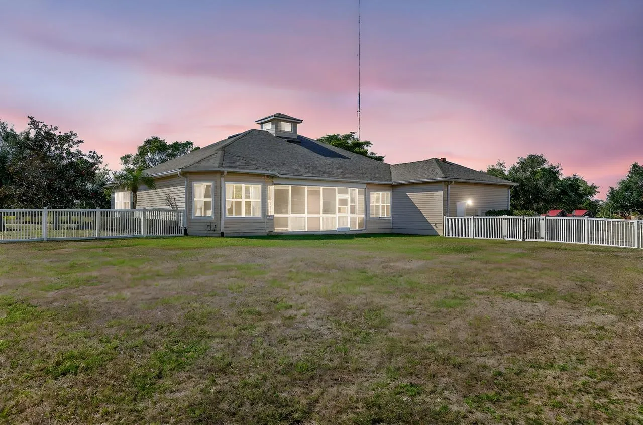 Enjoy tranquil picturesque sunsets from the privacy of your expansive wraparound front porch on over one acre of land! This must-see home features three bedrooms plus a den and two bathrooms with an open, light-filled floorplan. A large skylight enhances the abundant natural light, while soaring ceilings and a thoughtful layout add to the spacious atmosphere.