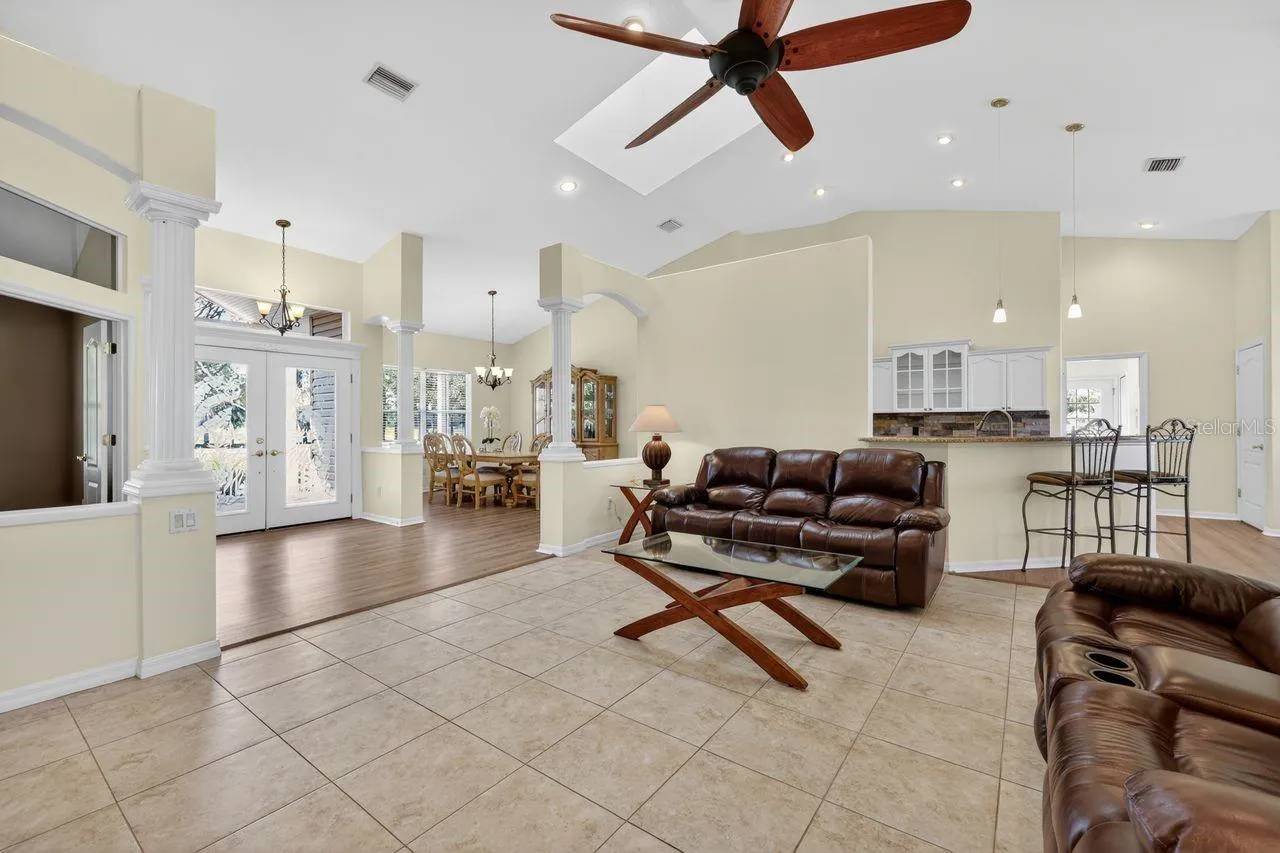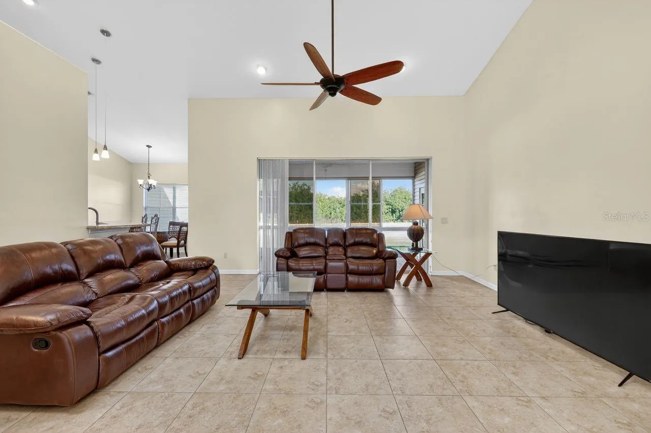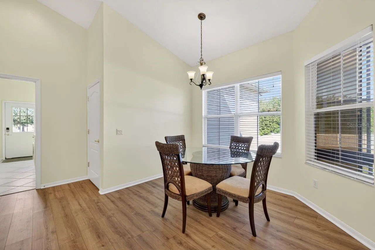 The den, complete with a transom window and French doors, can easily be converted into a fourth bedroom. The primary suite boasts a tray ceiling and two walk-in closets. The primary bathroom features dual vanities, a jetted tub, and a spacious double shower. The guest bathroom offers two vanity sinks and a step-in tub. Additional conveniences include fully screened and covered patio, and an inside laundry room. Recent updates comprise a newer roof (2020), luxury plank wood flooring (2020), interior paint (2025), and new outdoor landscape lighting. Exterior highlights include low-maintenance (no painting needed) vinyl siding, a two-car attached garage, and a fully fenced yard for your furry friends. If you are looking for a home surrounded with large open spaces instead of a cookie-cutter home on a postage stamp lot, this should be on top of your list! Owner may consider partial Seller financing.
