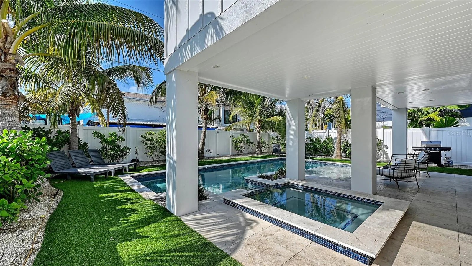 Premium amenities — rooftop deck with panoramic Gulf & Bay views, private heated pool & spa, BBQ area, and outdoor lounge