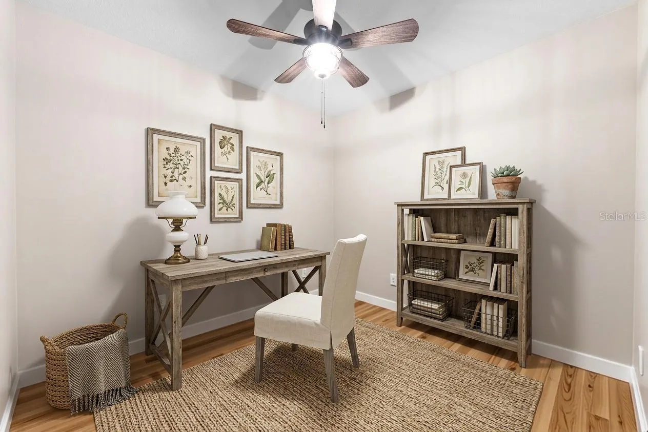 Inside, oak wood-style luxury vinyl flooring flows throughout, complemented by custom board-and-batten trim and wainscoting. The kitchen features upgraded cabinetry, along with a reverse osmosis system and water softener. Natural light fills the home through the glass front door with adjusted Bahamian blinds, while the electric fireplace adds warmth and charm.