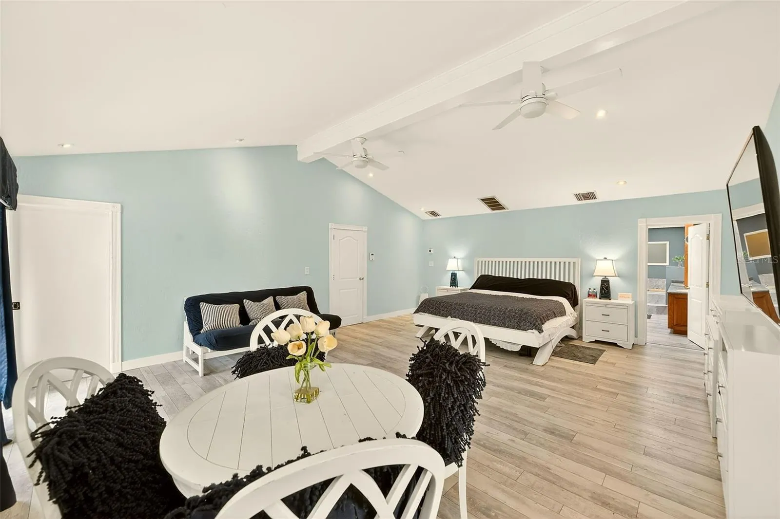 The secluded primary suite is tucked away on its own wing of the home with vaulted ceilings and direct access to the pool and lanai, creating a true private retreat. In total, three bedrooms enjoy peaceful views of the pool, including a private suite with a full bath designed with accessibility in mind, featuring a curbless roll-in shower and open layout—ideal for extended family, guests, or live-in care. A dedicated game room with billiards table overlooks the pool and opens directly to the lanai, creating seamless indoor-outdoor living and entertaining.