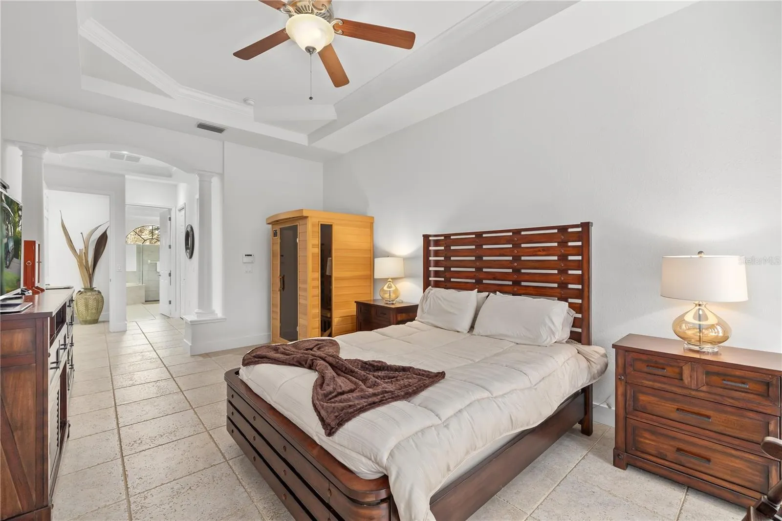 - Ceiling Fans(s), Crown Molding, Open Floorplan, Walk-In Closet(s), Living Room/Dining Room Combo, Eat-in Kitchen, Kitchen/Family Room Combo, Primary Bedroom Main Floor, Split Bedroom, Window Treatments, High Ceilings, Vaulted Ceiling(s), Solid Surface Counters, Cathedral Ceiling(s), Tray Ceiling(s), Built-in Features, Dry Bar, Sauna