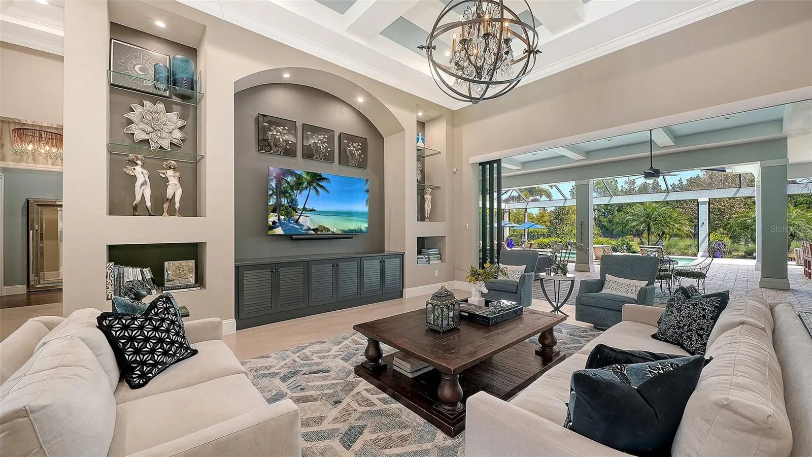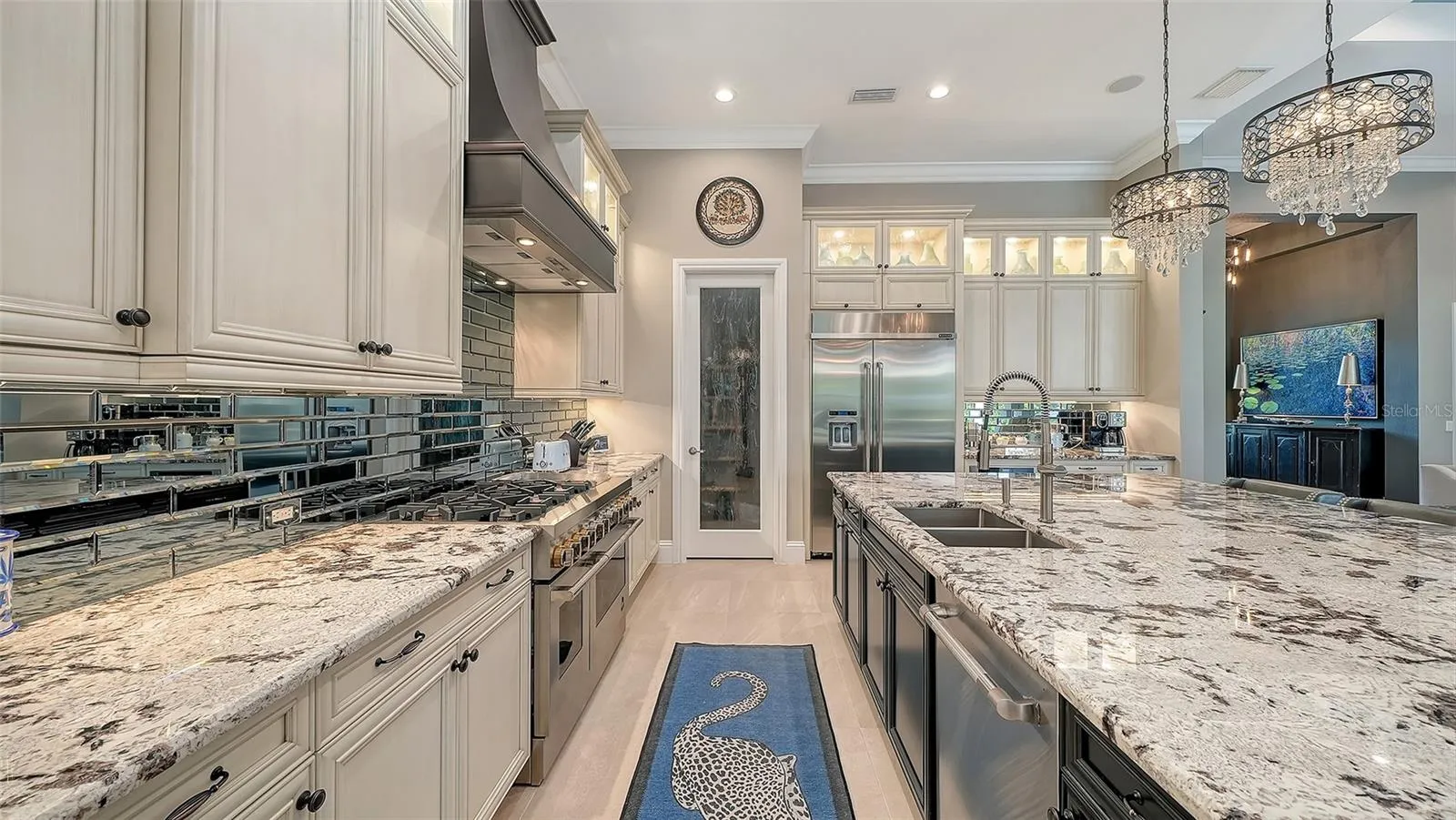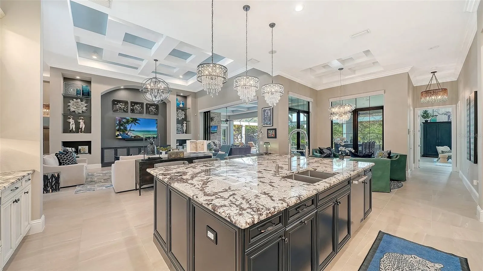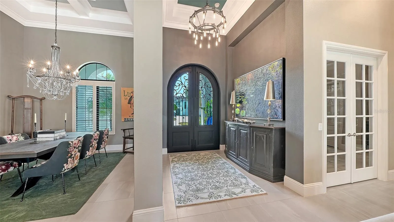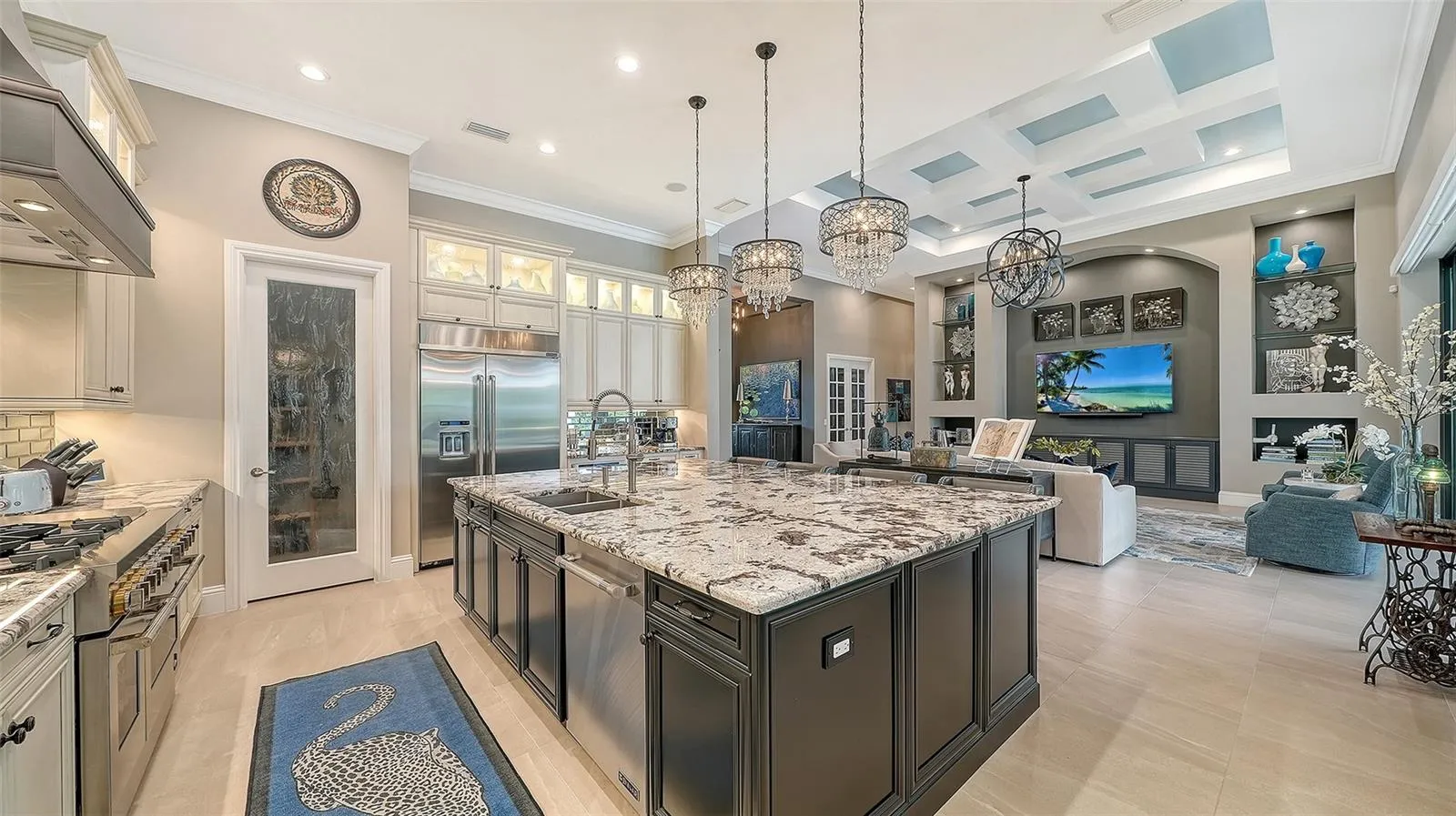 Interiors are defined by dramatic architectural ceiling treatments, custom millwork, designer chandeliers, rich crown molding, recessed lighting, and thoughtfully designed window treatments. The entire residence has been freshly repainted inside and out, presenting a pristine and flawless offering. The gourmet kitchen is a showpiece, featuring illuminated upper cabinetry, a striking smoked mirror glass backsplash, custom range hood, seamless one-piece granite island, updated sink and faucet, refined hardware, under-cabinet and pendant lighting, and newly refinished cabinetry. Living and entertaining spaces are enriched with custom crafted built-ins, tailored lighting, plantation shutters in the dining room, plush new carpeting in guest suites, and two private executive offices with custom cabinetry and French doors. The versatile bonus room offers elegant flexibility as a media room or additional guest suite. The sumptuous primary suite includes a reimagined, expanded couture closet with custom cabinetry, new carpeting, glass entry doors, and designer lighting. The spa-inspired primary bath boasts new quartz countertops, dual sinks, upgraded fixtures, illuminated custom mirrors, and artfully updated tile. A dramatic, designer powder room provides a striking statement of luxury. Notable enhancements include a whole-house water softener and filtration system, a whole-house Kohler generator and an epoxy floor coated 4-car garage!