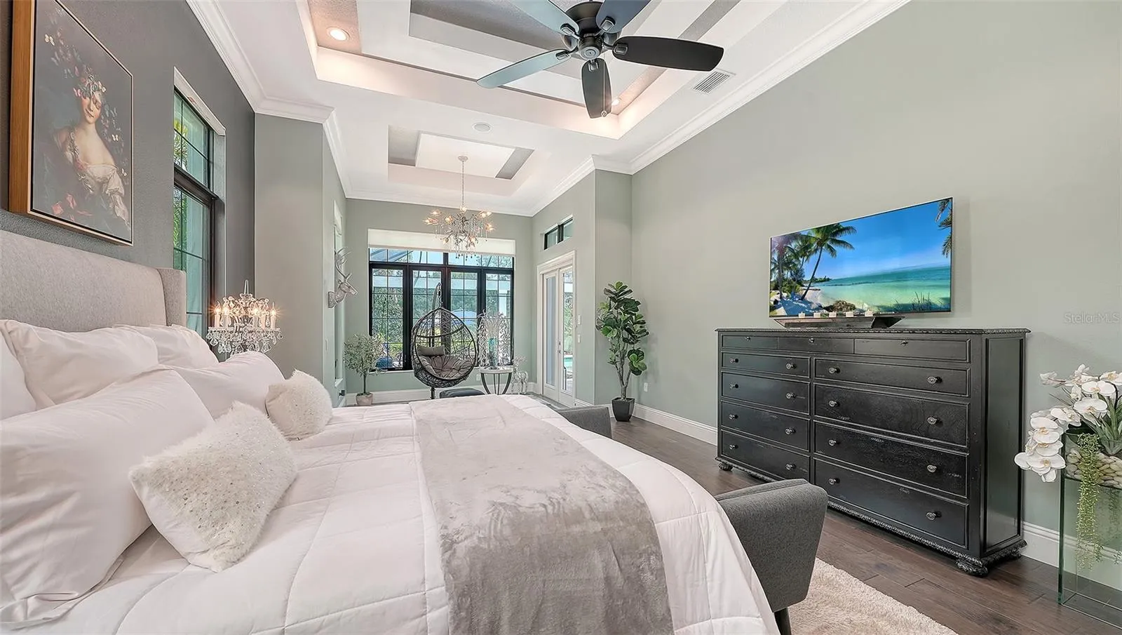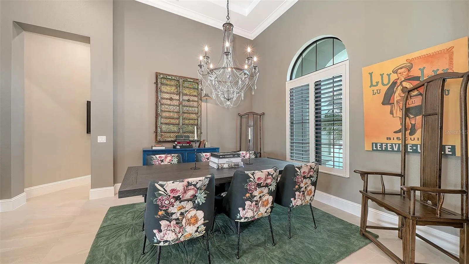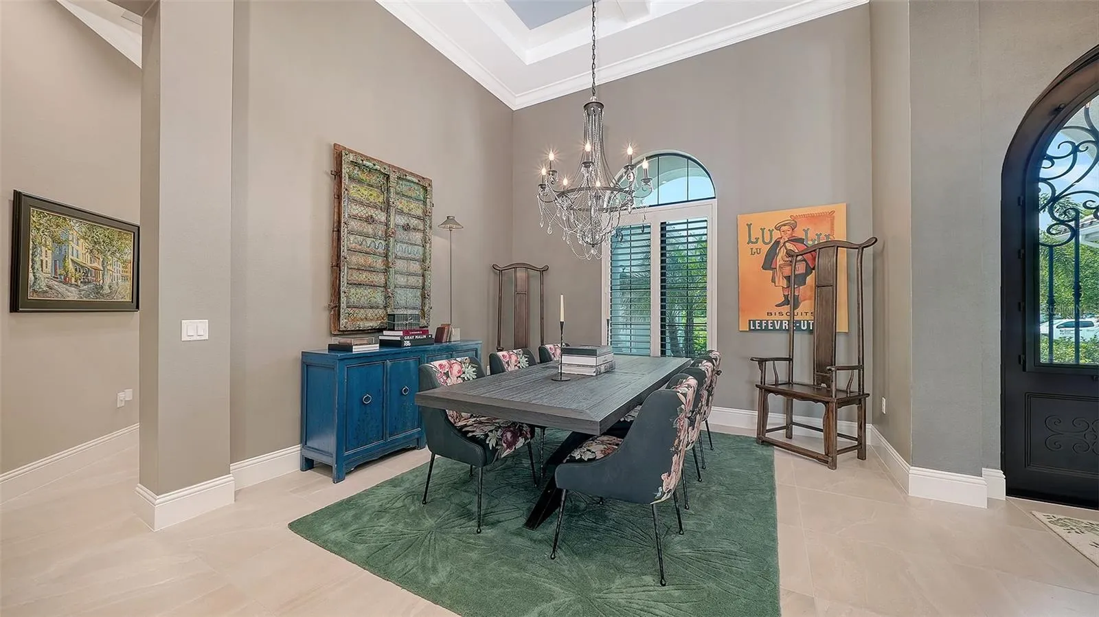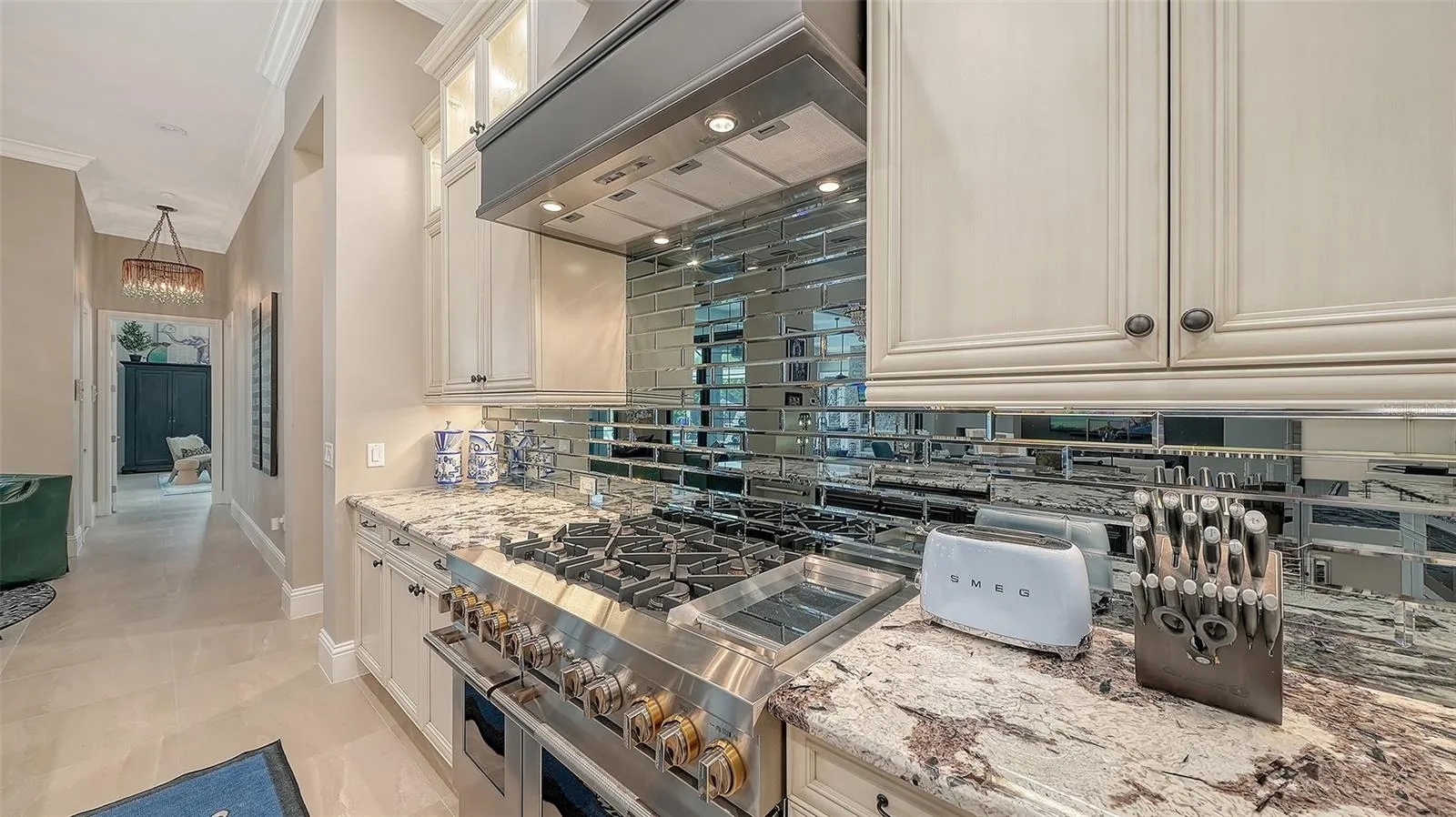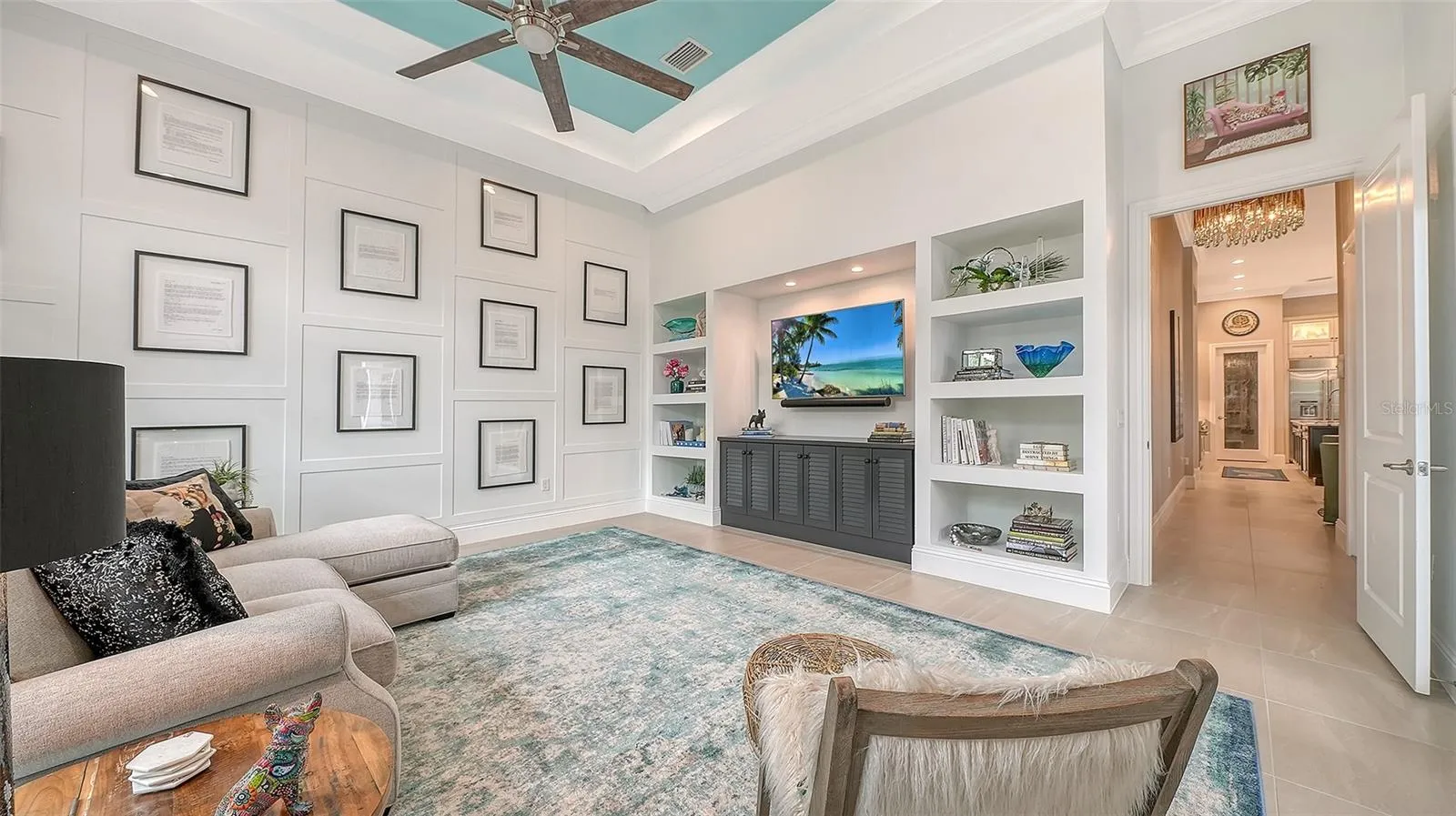Interiors are defined by dramatic architectural ceiling treatments, custom millwork, designer chandeliers, rich crown molding, recessed lighting, and thoughtfully designed window treatments. The entire residence has been freshly repainted inside and out, presenting a pristine and flawless offering. The gourmet kitchen is a showpiece, featuring illuminated upper cabinetry, a striking smoked mirror glass backsplash, custom range hood, seamless one-piece granite island, updated sink and faucet, refined hardware, under-cabinet and pendant lighting, and newly refinished cabinetry. Living and entertaining spaces are enriched with custom crafted built-ins, tailored lighting, plantation shutters in the dining room, plush new carpeting in guest suites, and two private executive offices with custom cabinetry and French doors. The versatile bonus room offers elegant flexibility as a media room or additional guest suite. The sumptuous primary suite includes a reimagined, expanded couture closet with custom cabinetry, new carpeting, glass entry doors, and designer lighting. The spa-inspired primary bath boasts new quartz countertops, dual sinks, upgraded fixtures, illuminated custom mirrors, and artfully updated tile. A dramatic, designer powder room provides a striking statement of luxury. Notable enhancements include a whole-house water softener and filtration system, a whole-house Kohler generator and an epoxy floor coated 4-car garage!