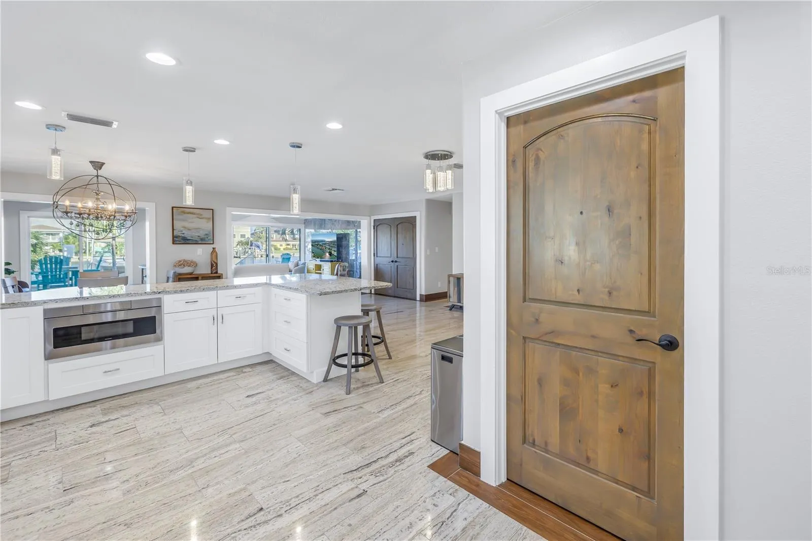 The open concept living space is light and bright, ideal for entertaining, has updated travertine tile floors, a huge 2021 updated kitchen featuring wood cabinets, 2020 stainless appliances, granite counters and loads of counter space and storage.