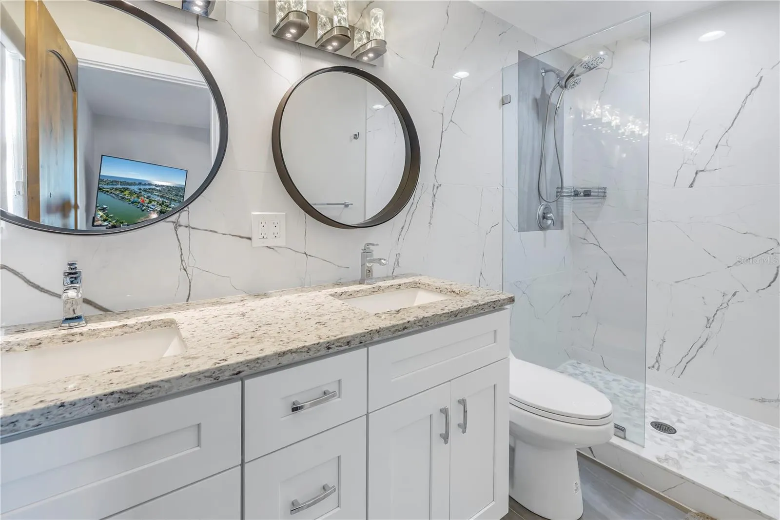 The downstairs owners suite has an impact sliding door to the backyard/pool and a view of the waterfront, an ensuite, updated bathroom with shower and double vanity.