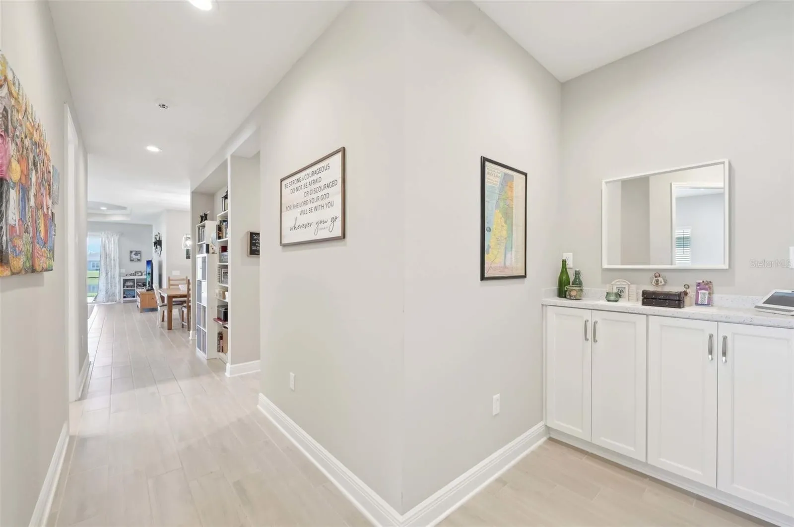 Welcome to your dream home—a single story Neal Communities masterpiece on an oversized lot perfectly situated in the highly desirable Parrish, FL school district. From the moment you step inside, this home exudes warmth and sophistication. With 10-foot ceilings, wood-grain tile throughout, and a seamless open-concept layout, every inch is designed for both comfort and entertaining. The gourmet kitchen is a true centerpiece, featuring stainless steel appliances, a large island with breakfast bar, and gleaming quartz countertops. The great room is flooded with natural light thanks to oversized windows and a three-panel sliding glass door, which opens to an extended covered patio with serene preserve and pond views—a perfect backdrop for morning coffee or sunset gatherings. The owner’s suite is a private retreat, complete with dual walk-in closets, a luxurious ensuite bathroom with dual vanities, a walk-in shower, and a private water closet. Guests will appreciate the split floor plan, offering two bedrooms and a semi-private bathroom for added comfort. Need a home office or creative space? A versatile den/office with French doors and front yard views checks that box beautifully. Located in Wildleaf at North River Ranch, you’ll enjoy access to world-class amenities, including Camp Creek, a 12+ acre center with trails, pickleball courts, BMX bike park, pool with slides, a cozy café, EV charging stations, bike share, and vintage-inspired gathering spaces for neighbors and friends to connect. Whether you’re hosting, relaxing, or exploring the community, this home is ready to elevate your lifestyle. Is this your perfect match? Schedule your private tour today and come experience the lifestyle waiting for you at North River Ranch!