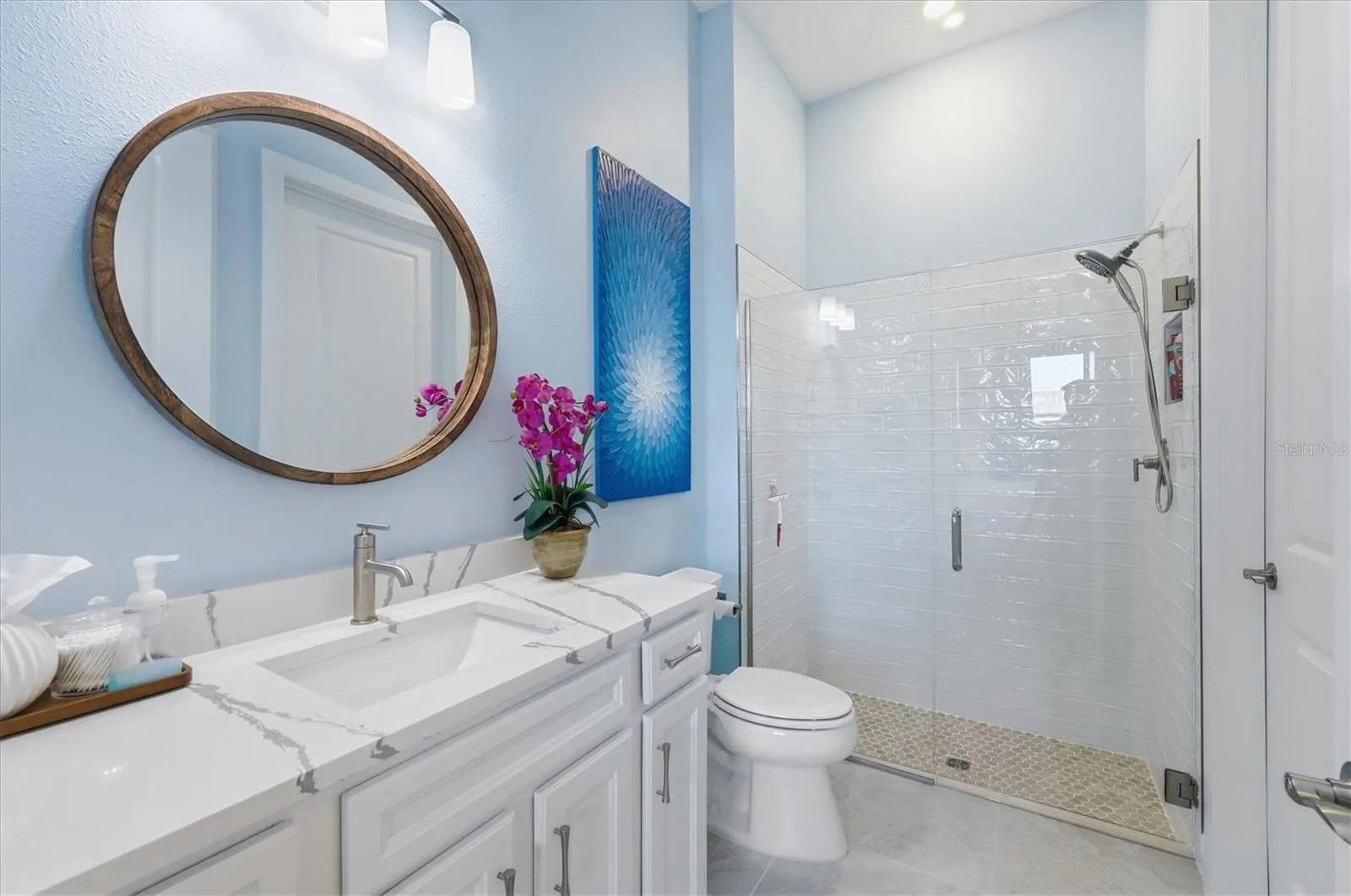 The primary suite is a true retreat, featuring dual walk-in closets and a spa-inspired bath anchored by a walk-in Super Shower with integrated bench seating — offering both luxury and long-term comfort for aging in place.