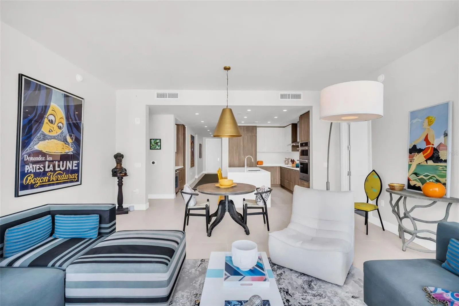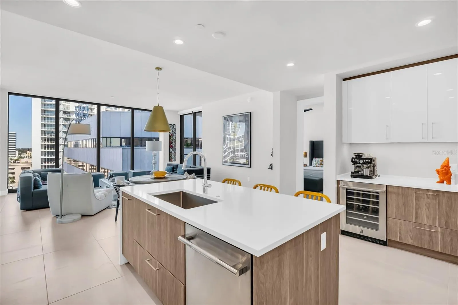 The open great room is anchored by porcelain tile flooring throughout the main living areas and baths, creating a sleek, cohesive aesthetic. Electric automated window treatments offer instant control over light and privacy, while expansive glazing keeps the water and skyline views front and center. The kitchen makes a refined statement with a full JennAir stainless appliance package, complemented by a seamless, panel-ready French-door refrigerator that integrates cleanly with the cabinetry for a streamlined look.