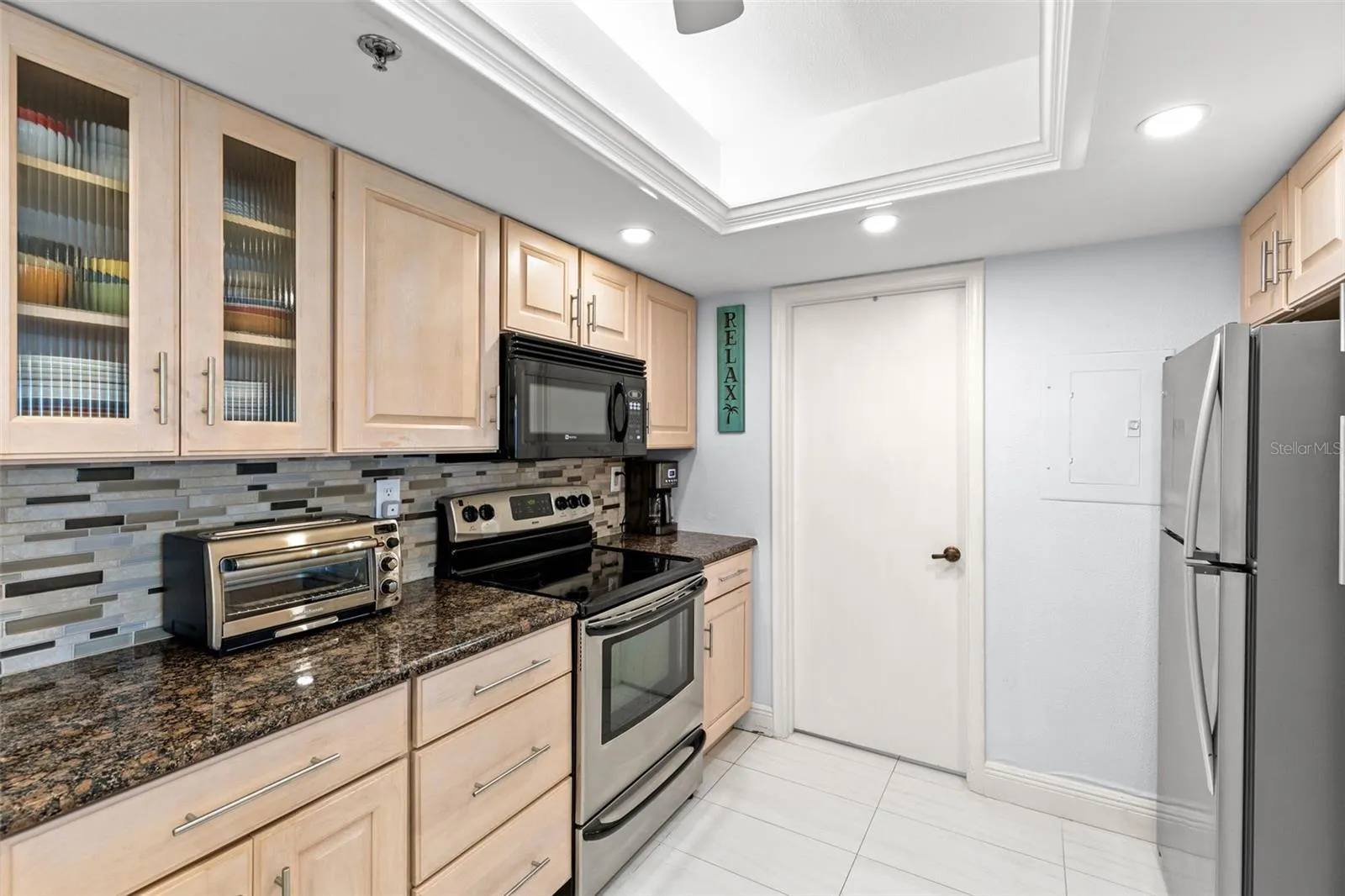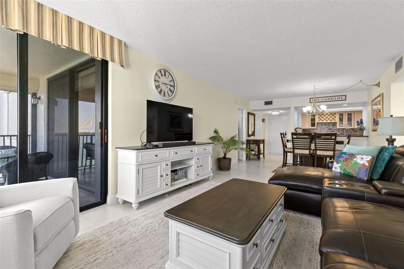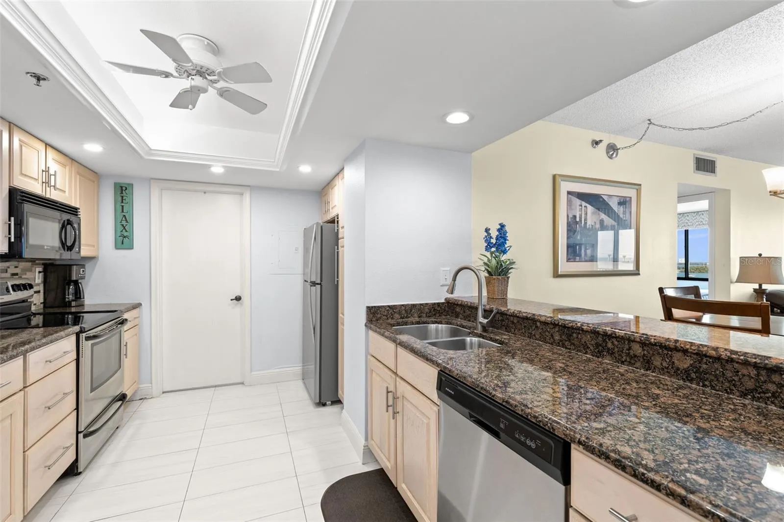 Thoughtfully designed to maximize light and views, the open-concept living area features bright coastal finishes and elegant ceramic tile floors. The gourmet kitchen boasts granite counters, rich wood cabinetry, and a large breakfast bar perfectly situated to overlook the water — ideal for entertaining or relaxed mornings.