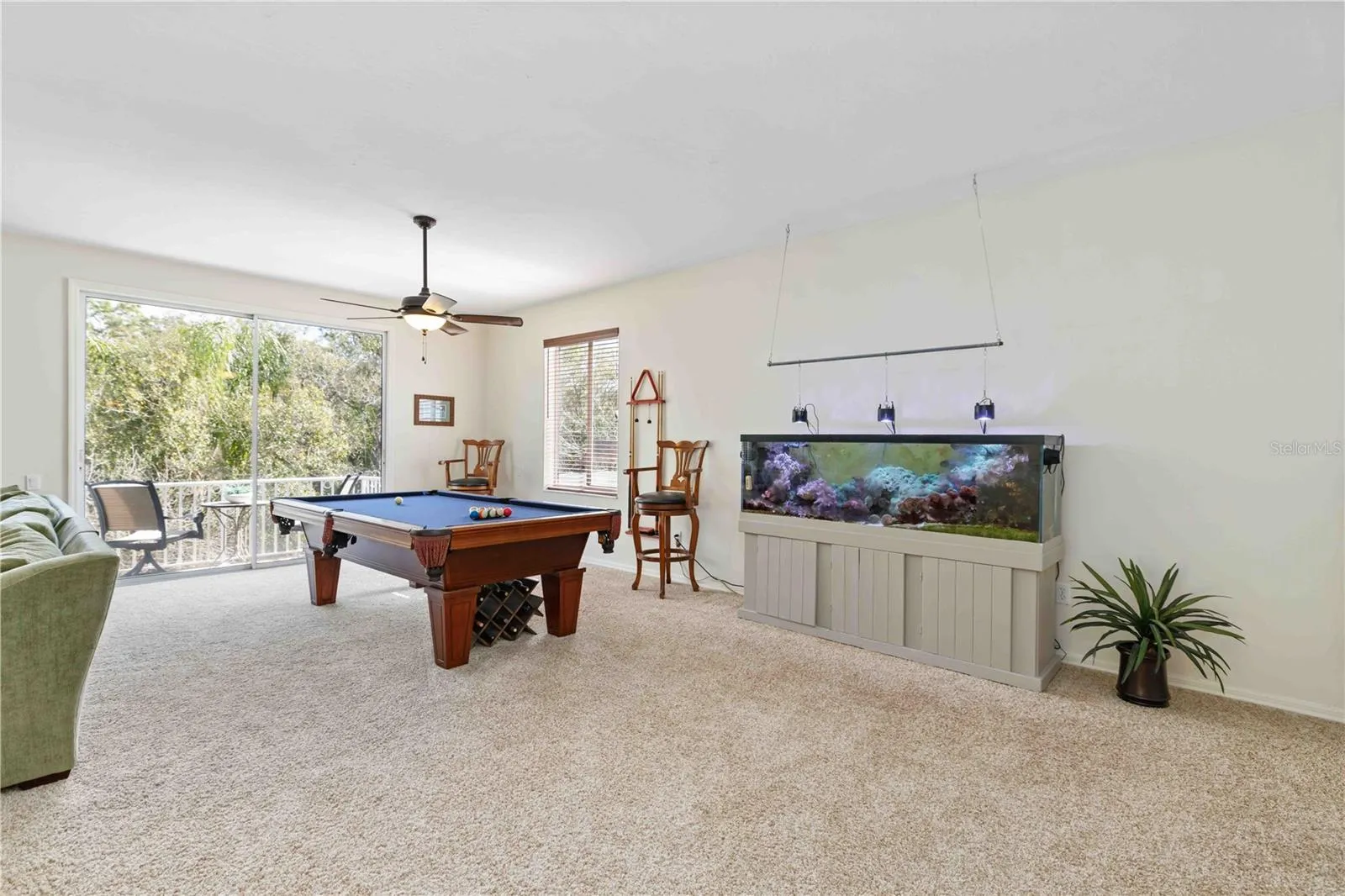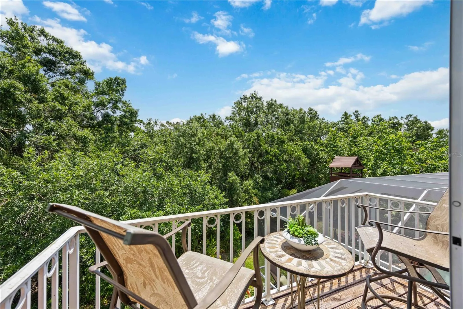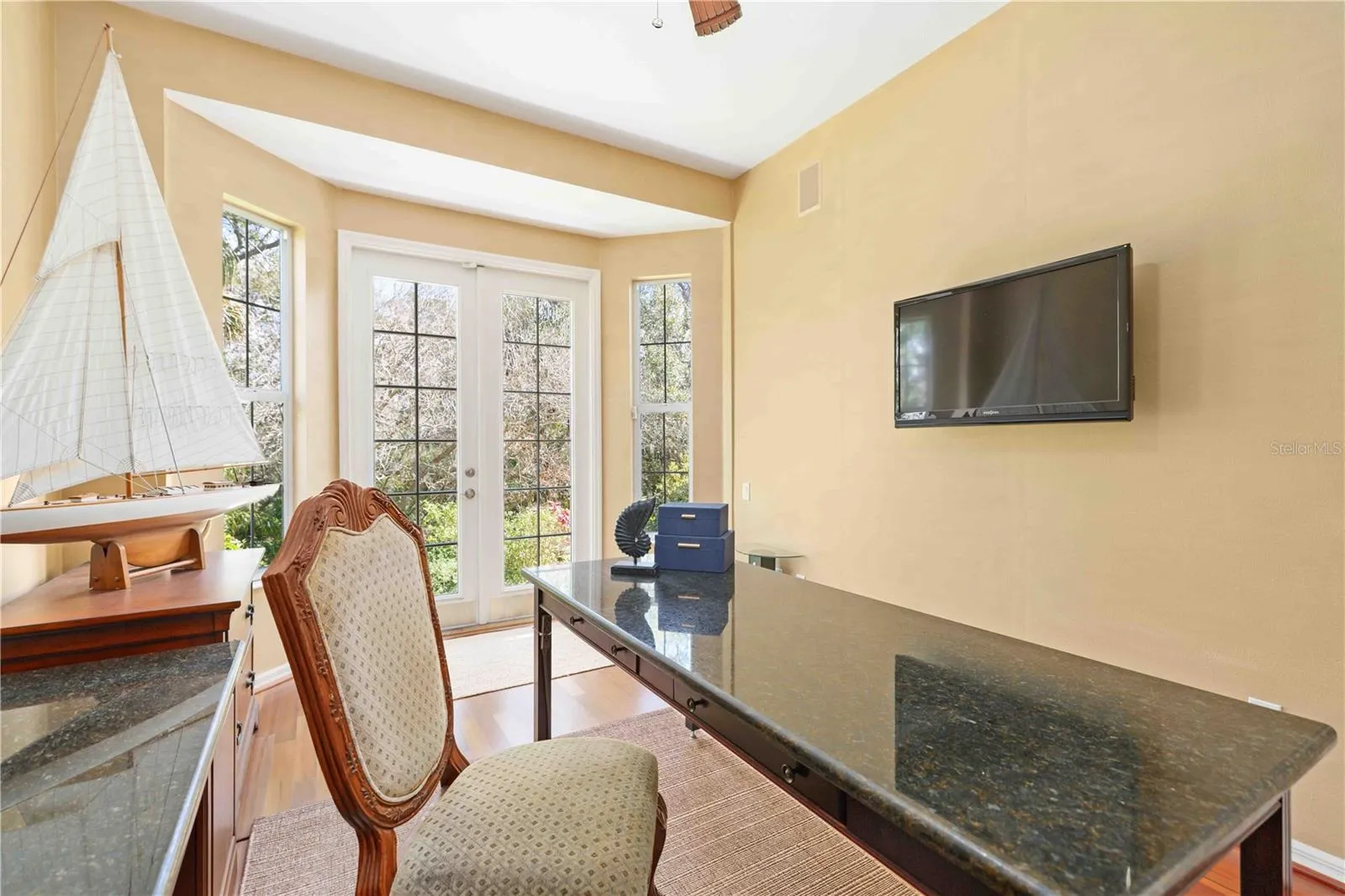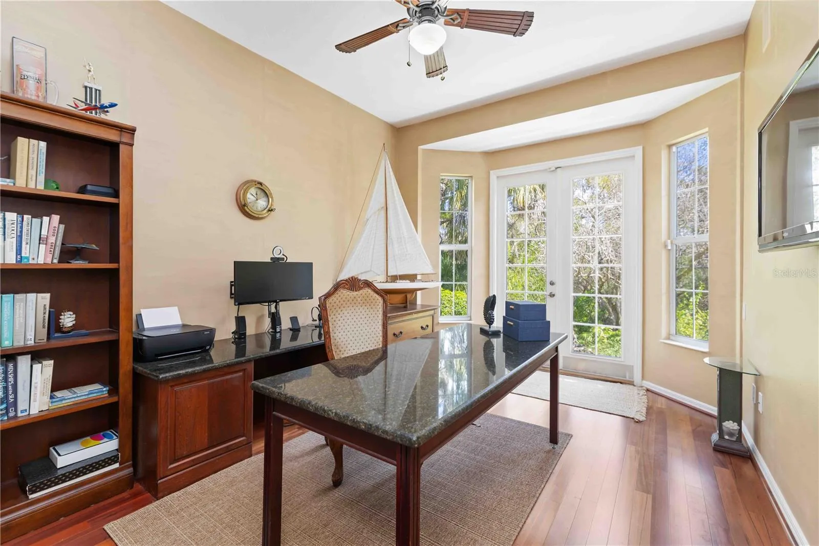 Inside, the home offers four spacious bedrooms, three full bathrooms, a private den, and an upstairs bonus room with its own balcony. The main level features a generous primary suite with French doors opening to the lanai, a dedicated home office, and a secluded guest bedroom. The open-concept kitchen includes natural gas cooking, freshly painted cabinetry, and seamless flow into the main living areas.