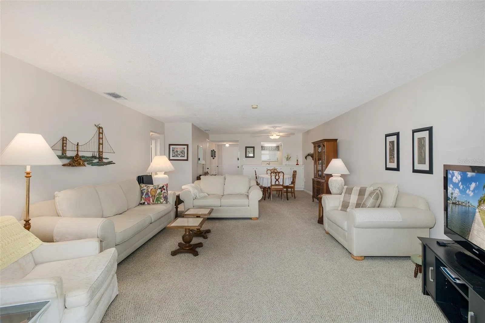 Perched on the 3rd floor of a tower building with convenient elevator access, this inviting 2-bedroom, 2-bath residence offers an open floor plan designed to maximize comfort and coastal views. The home features a sun-drenched Florida room with four large windows overlooking the north channel of the Gulf of America, creating a bright and peaceful space perfect for enjoying your morning coffee or relaxing while watching dolphins swim through the channel. The kitchen offers abundant countertop space and two pantry areas, providing exceptional storage. New stainless steel appliances have been ordered and will be installed in the coming weeks. A convenient pass-through connects the kitchen to the dining and living areas, making the layout ideal for both everyday living and entertaining. A split-bedroom floor plan provides added privacy. The spacious primary suite features a large walk-in closet and a full bath, along with new plush carpeting. Sliding doors from the primary bedroom lead directly to the Florida room, allowing you to enjoy the beautiful water views anytime. The suite also includes pull-down attic stairs, offering additional storage and convenience. The guest bedroom features a window with scenic views of Dog Bone Lake and the community’s 10 bocce ball courts, along with a large closet and a full bath located just outside the door. The entryway, kitchen hallway, and both bathrooms have recently been updated with elegant ivory tile, and the hallway features a newly installed electrical fuse panel for added safety. Located on the third floor, this home experienced no water intrusion during the recent historic storms. This property may be sold furnished with the right offer, making it an easy move-in opportunity. Residents enjoy a wide range of resort-style amenities including multiple pools, one of which is heated for year-round enjoyment, tennis courts, bocce ball courts, a clubhouse with fitness center, and a community boat ramp perfect for launching kayaks or canoes. Owners also have the option to join a private beach club for a small fee, featuring a sparkling sandy beach and cabanas. With incredible views, thoughtful updates, and an abundance of amenities, this home offers the perfect blend of comfort and coastal lifestyle. Call your real estate professional today to schedule a showing and see all that this wonderful property has to offer.