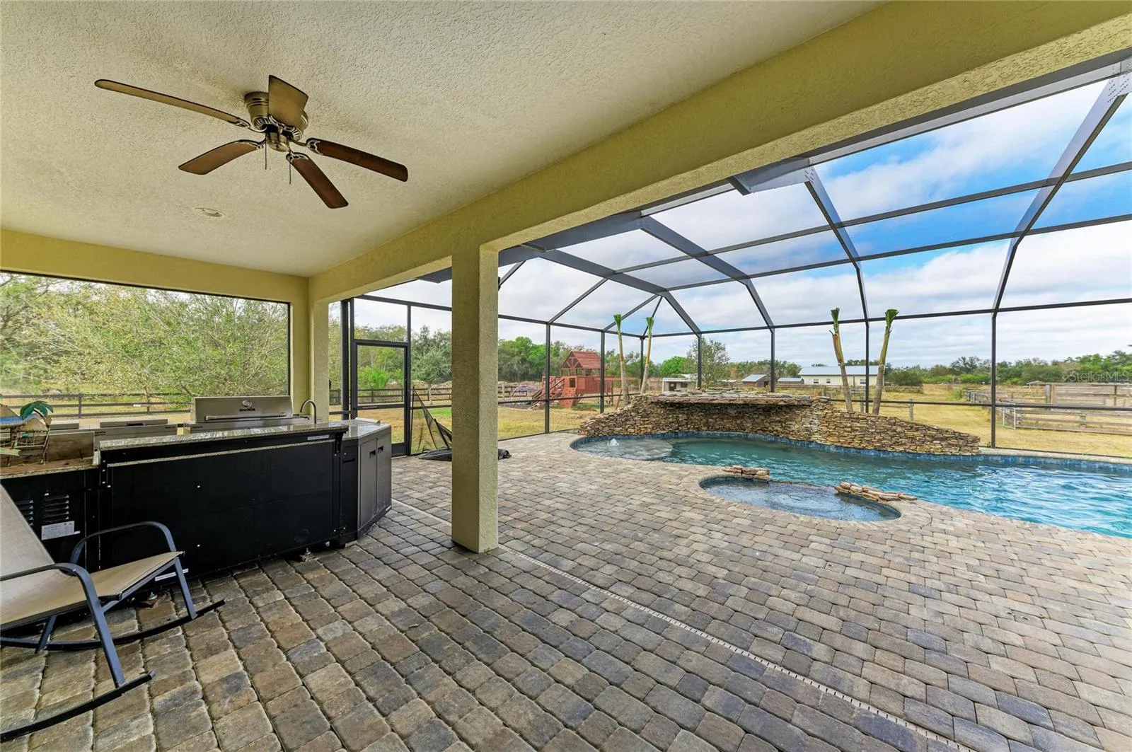 Outdoor living is the centerpiece, featuring a custom saltwater pool with a dramatic rock grotto waterfall, fire feature, attached spa, lounge pad, and expansive screened lanai. A full outdoor kitchen and poolside fire pit create an ideal setting for entertaining or relaxing in complete privacy. The property is fully equipped for animals with sectioned fencing, stalls, feed stations, and a barn with electric, water, and bathroom.