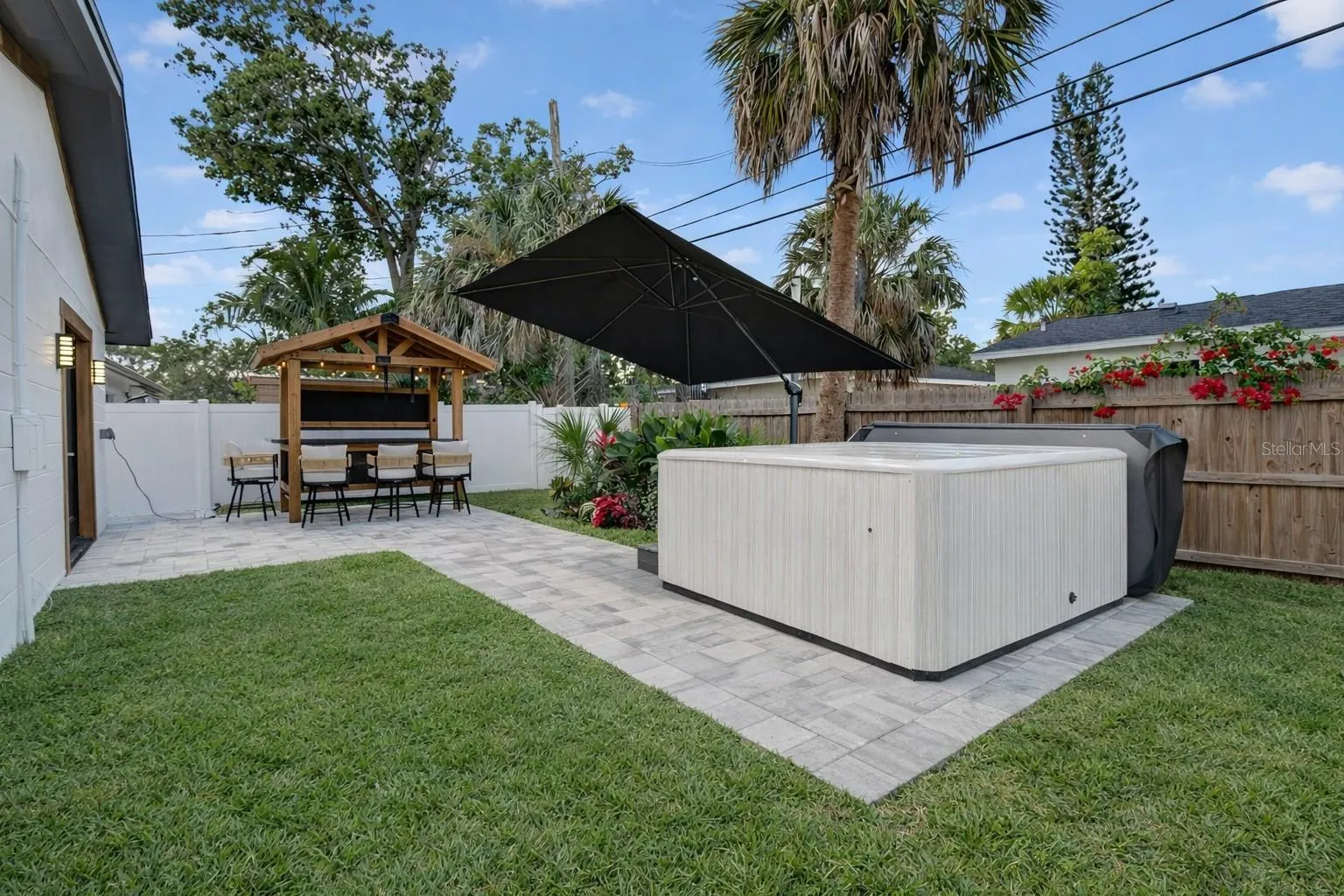 Outside is where this home continues to shine. The backyard is designed for entertaining, featuring new concrete pavers, a cedar outdoor bar with electrical hookups and barstools included, and a brand-new six-person hot tub — an ideal setup for hosting or unwinding at home.