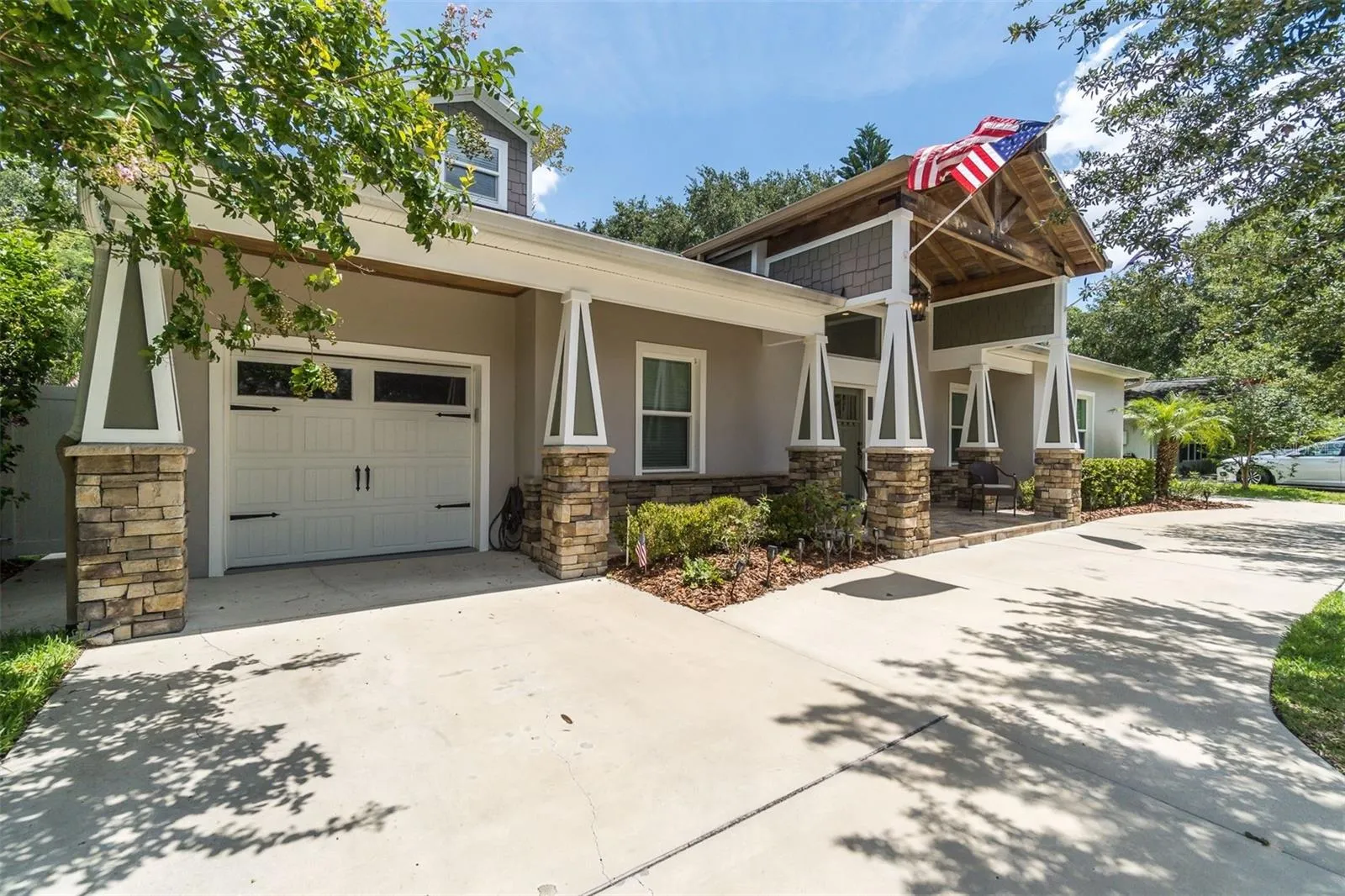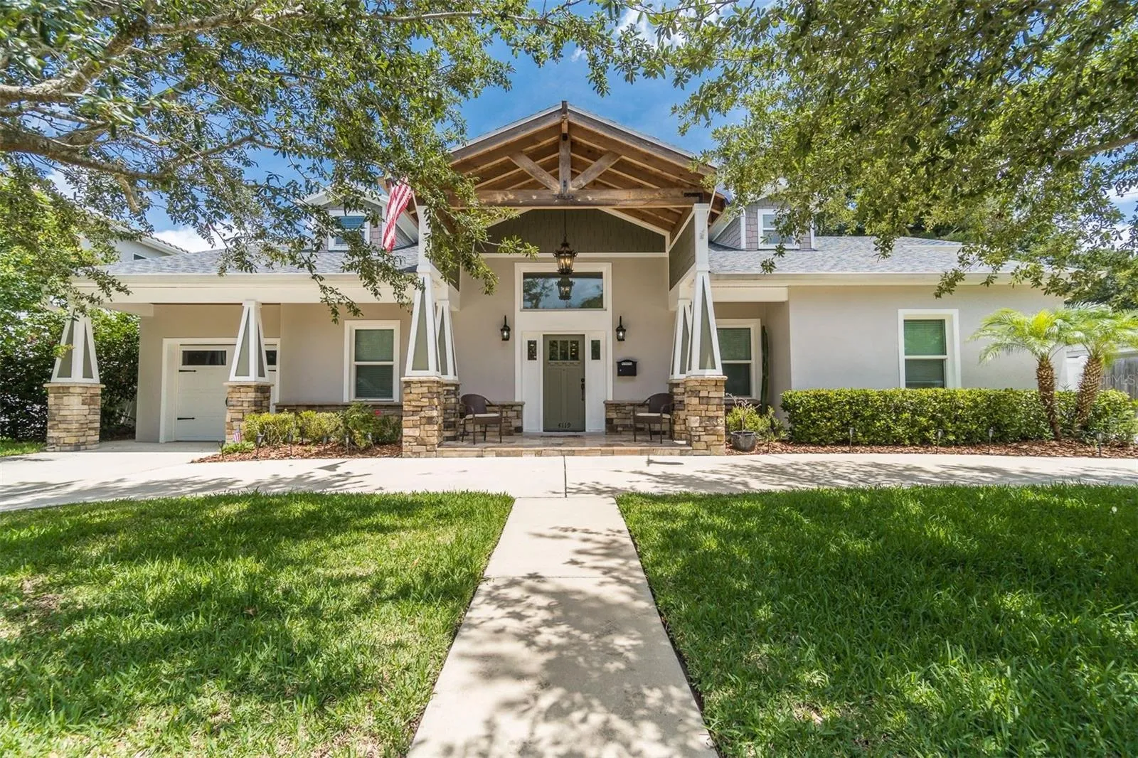 Experience the epitome of luxurious living in the heart of South Tampa, in this spectacular remodeled home masterfully combining modern elegance with timeless charm. Originally built in 1947, this exquisite residence spans 2,903 heated square feet of living space, featuring 4 bedrooms and 3 1/2 baths, including two opulent primary suites. Upon arrival, the home’s striking curb appeal immediately captures your attention. A lush green lawn and circular driveway adds grandeur. A spacious garage sits on one side of the home and carport on the other, ensuring ample parking for family and guests. The stunning portico front entrance with stacked stone pillars framing the entryway, and a paver front porch invites you to admire the meticulous landscaping. The front door enhanced by a transom window allows natural light to flood the foyer and living room creating a warm and welcoming ambiance. A culinary dream is the kitchen with tall cabinets topped with crown molding, stainless pulls, and glass inserts with lighting as well as under cabinet lighting. The tile backsplash complements the Quartz counters. Stainless appliances include a cooktop, vent hood, French door refrigerator with bottom freezer, microwave and prep sink. A large center island houses a stainless double sink and dishwasher, with a counter height breakfast bar illuminated by lighting above – perfect for morning coffee. An adjacent café area features built-in seating for casual dining, enhancing the kitchen’s functionality and charm. A walk-in pantry plus an additional pantry allows for plenty of storage. Indulge yourself in one of the two primary retreats, each featuring an ensuite bath. One suite boasts large separate vanities, Quartz topped, a private water closet, a large soaking tub, a seamless glass shower enclosure with bench seat, and a walk-in closet. This retreat has its own private covered and screened porch. The other suite has similar design features, including a spacious ensuite with a stunning shower enclosure, tile surround and two walk-in closets. A French door with blinds between the glass in the café area leads to the paver lanai, which is screen enclosed and equipped with double ceiling fans, offering a view of the grassy fenced backyard. The second floor is ready for a buildout to add additional living space. Located in Flood Zone X500. This home is within the highly sought after Plant High School district. It provides easy access to major highways, including the Selmon Expressway, I-275, Bayshore Boulevard, Gandy Boulevard, downtown Tampa, Tampa International Airport, Tampa General Hospital, prime dining venues, shopping, entertainment, and sporting venues, and all that South Tampa has to offer. Don’t delay- schedule your private showing today!