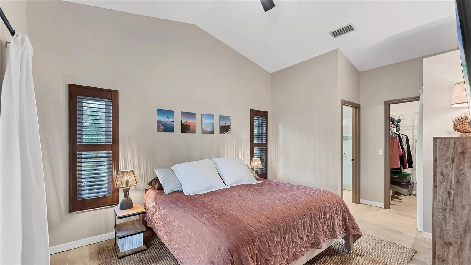 - Walk-In Closet(s), Primary Bedroom Main Floor, Split Bedroom, Vaulted Ceiling(s), Solid Wood Cabinets