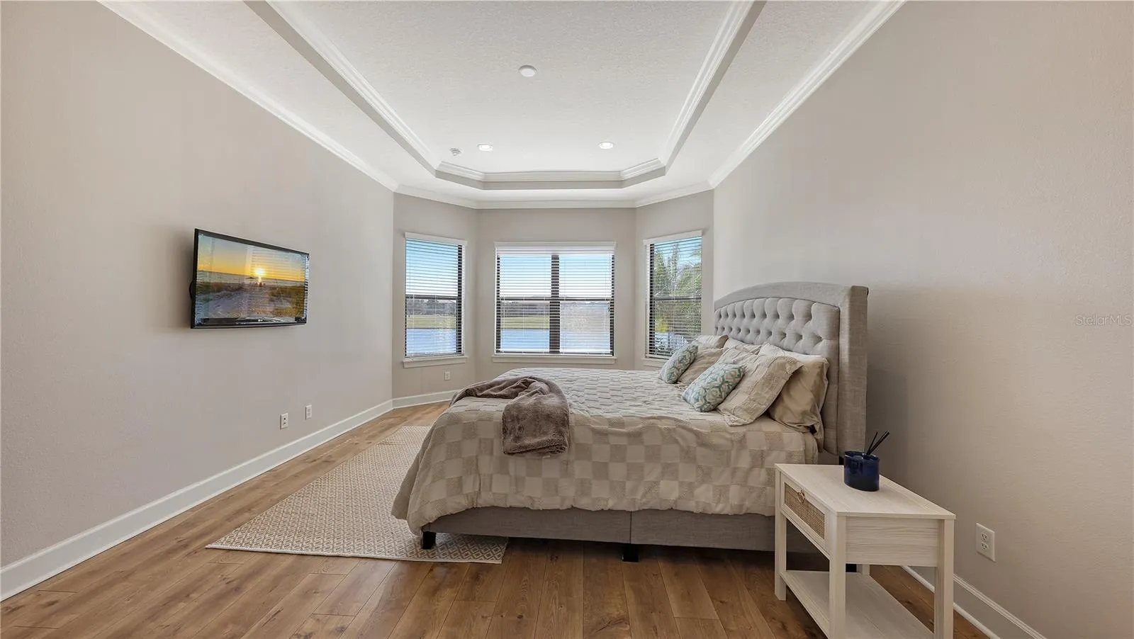 Embrace the ultimate golf lifestyle in this deeded golf and water-view residence within the prestigious Esplanade at Lakewood Ranch. Designed for both comfort and sophistication, this three-bedroom, three-bath single-family home offers a bright, open-concept layout ideal for entertaining after a day on the course. Tray ceilings in the great room and primary suite add architectural elegance, while the chef’s kitchen features sleek white cabinetry and seamless flow into the living spaces. Wood-look laminate flooring provides refined style with easy maintenance. Step onto the screened lanai to unwind while enjoying tranquil fairway and water views — the perfect setting for morning coffee or sunset relaxation.