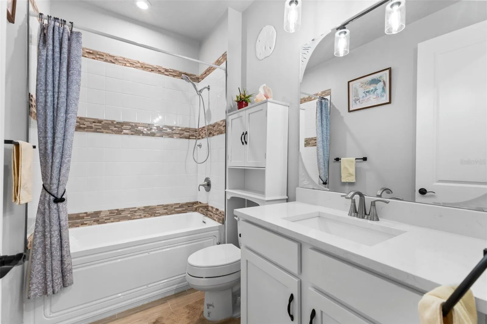 The primary suite provides a private retreat with dual sinks and a glass-enclosed shower, while the additional bedrooms offer comfort and privacy for family or guests. Since purchase, the owner has added numerous upgrades including ceiling fans in every room, upgraded lighting with kitchen pendants and chandeliers, custom blinds, and additional storage solutions. The laundry room features a utility sink, and the garage includes overhead storage along with an epoxy-coated floor. Bathroom improvements include upgraded lighting, added storage, tile accents, motion-activated switches, and a jetted tub in the guest bath.