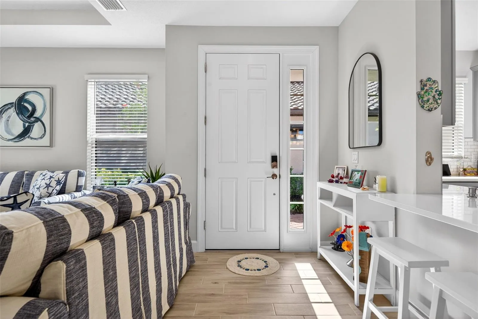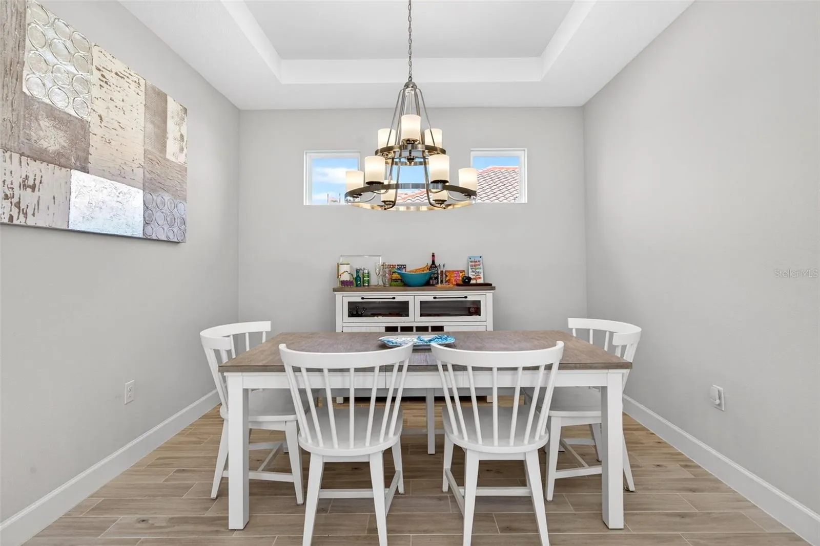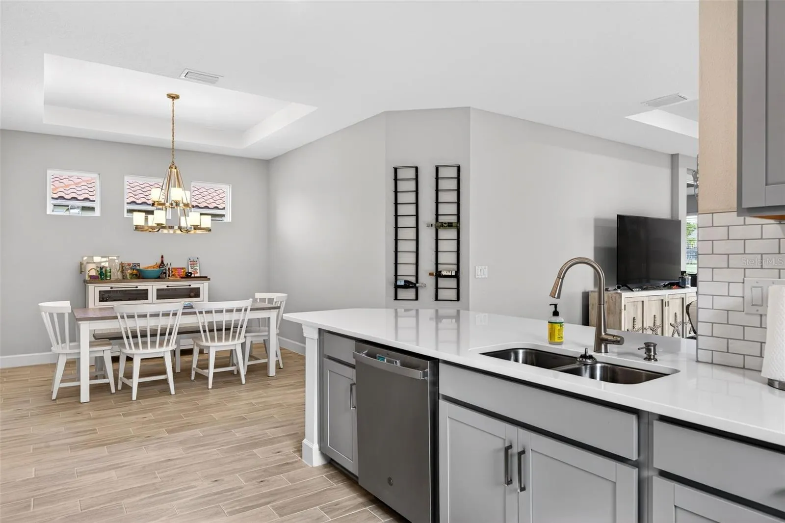Inside, light-filled living spaces showcase neutral tile flooring throughout the main areas, tray ceilings, recessed lighting, and a soft, coastal-inspired color palette. The open-concept design flows effortlessly, making everyday living and entertaining feel seamless. The kitchen is both stylish and functional, featuring quartz countertops, stainless steel appliances, ample cabinetry, and a timeless tile backsplash, all overlooking the dining and living areas.