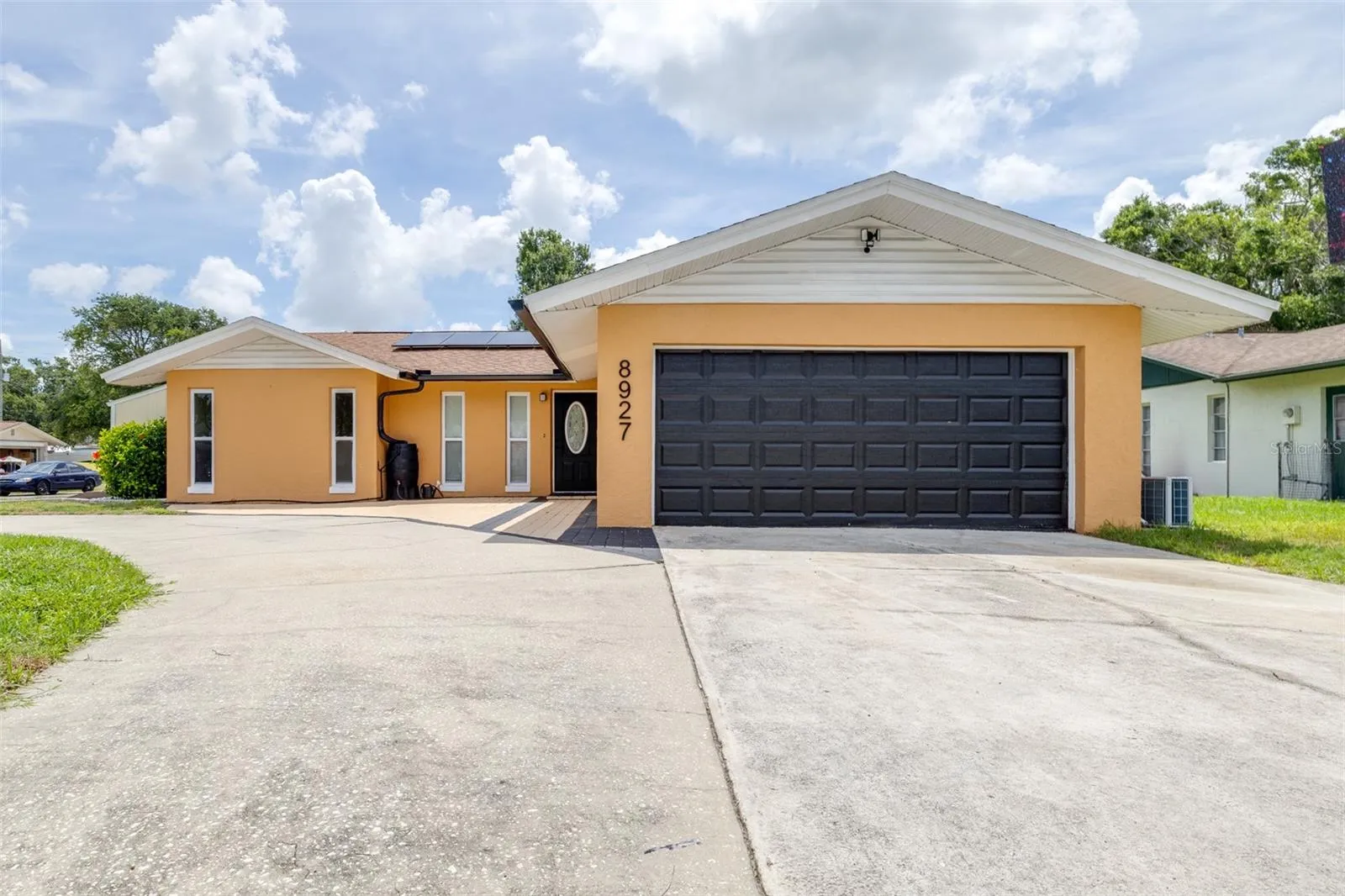 Welcome to your beautifully renovated, move-in ready home in the heart of Seminole. This charming 3-bedroom, 2-bath pool home with no HOA features 1,383 square feet of open-concept living space. A spacious circular driveway provides both impressive curb appeal and convenient access, offering ample parking for guests and multiple vehicles. After walking through the sizable front patio, step into a bright and spacious combo family room / dining room with a natural black stone fireplace feature that flows seamlessly into an updated kitchen, complete with brown shaker cabinetry, granite countertops and stainless steel appliances package and a separate breakfast nook area with a slider that leads to a screened in lanai, offering beautiful views of the sparkling pool and direct access to a large backyard with a gazebo—perfect for relaxing evenings. The split-bedroom floor plan provides privacy, with two spacious guest bedrooms and a shared bathroom featuring an updated modern vanity and a tiled bathtub on one side of the home, while the primary bedroom is tucked away on the opposite side and offers an en-suite master bath with 2 closets, an updated walk-in shower and an updated his and her double sink modern vanity. Additional updates include a newer HVAC system (2024), updated tempered glass windows and impact rated doors (2017), new pool pump (2025), gutters (2024), solar panels (2023), new water heater( 2022), fresh interior and exterior paint (2024), pool deck paint (2024), new tile in all bedrooms (2025), gazebo and shed installed in (2023), and an insulated, air conditioned garage, roof (2013).