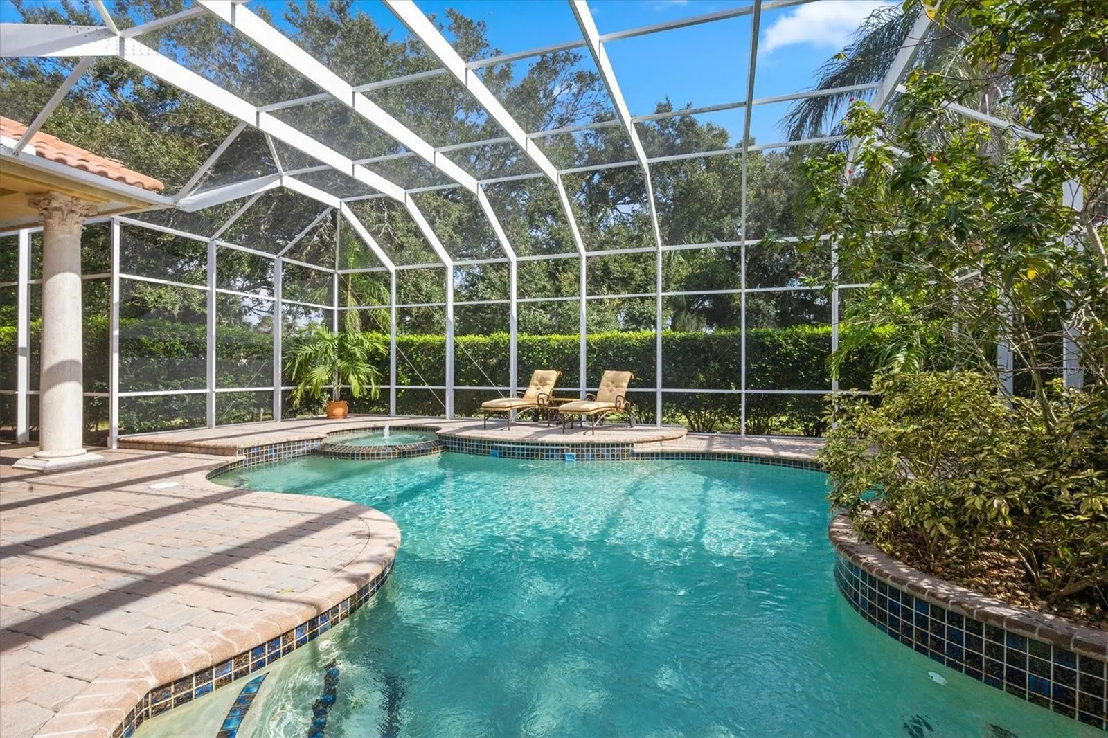 Outdoor living is exceptional, with a covered lanai supported by architectural columns and a fully screened pool enclosure. The pavered deck surrounds a sparkling pool, offering a serene, resort-style setting for year-round enjoyment.