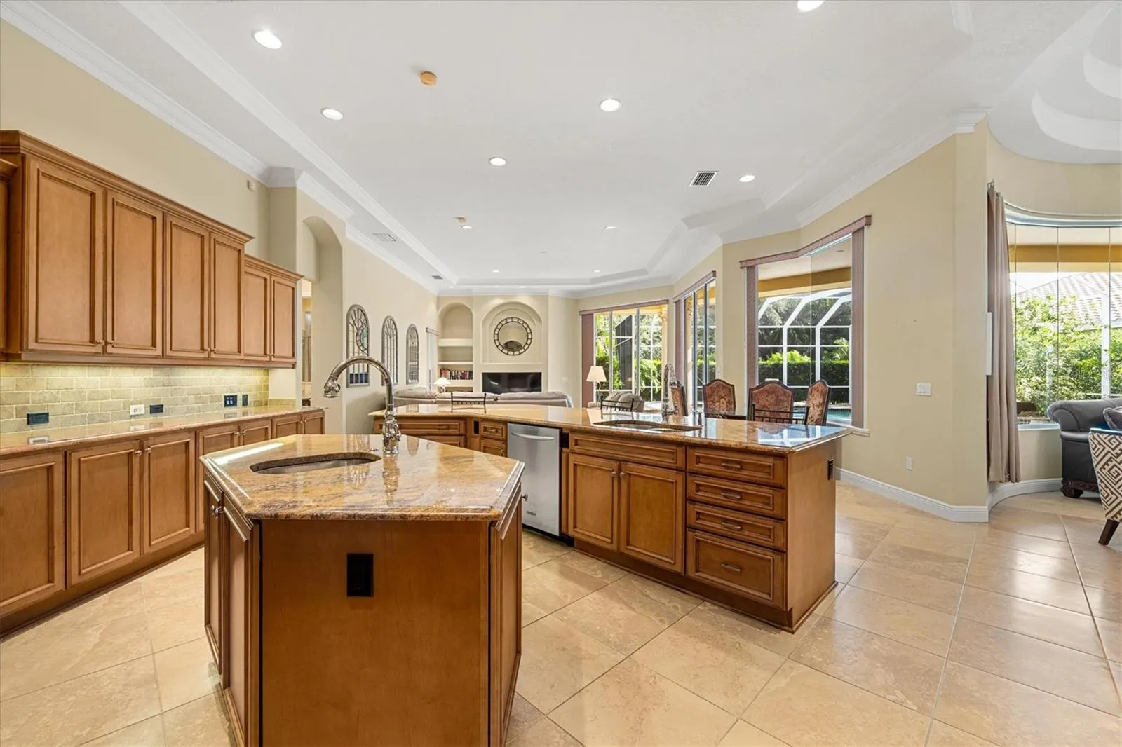 The gourmet kitchen is the heart of the home, offering rich wood cabinetry, expansive granite countertops, a large center island with seating, professional gas range, double ovens, and high-end stainless appliances. The kitchen flows seamlessly into the family room, where built-ins and large sliding glass doors connect indoor living to the outdoor retreat.