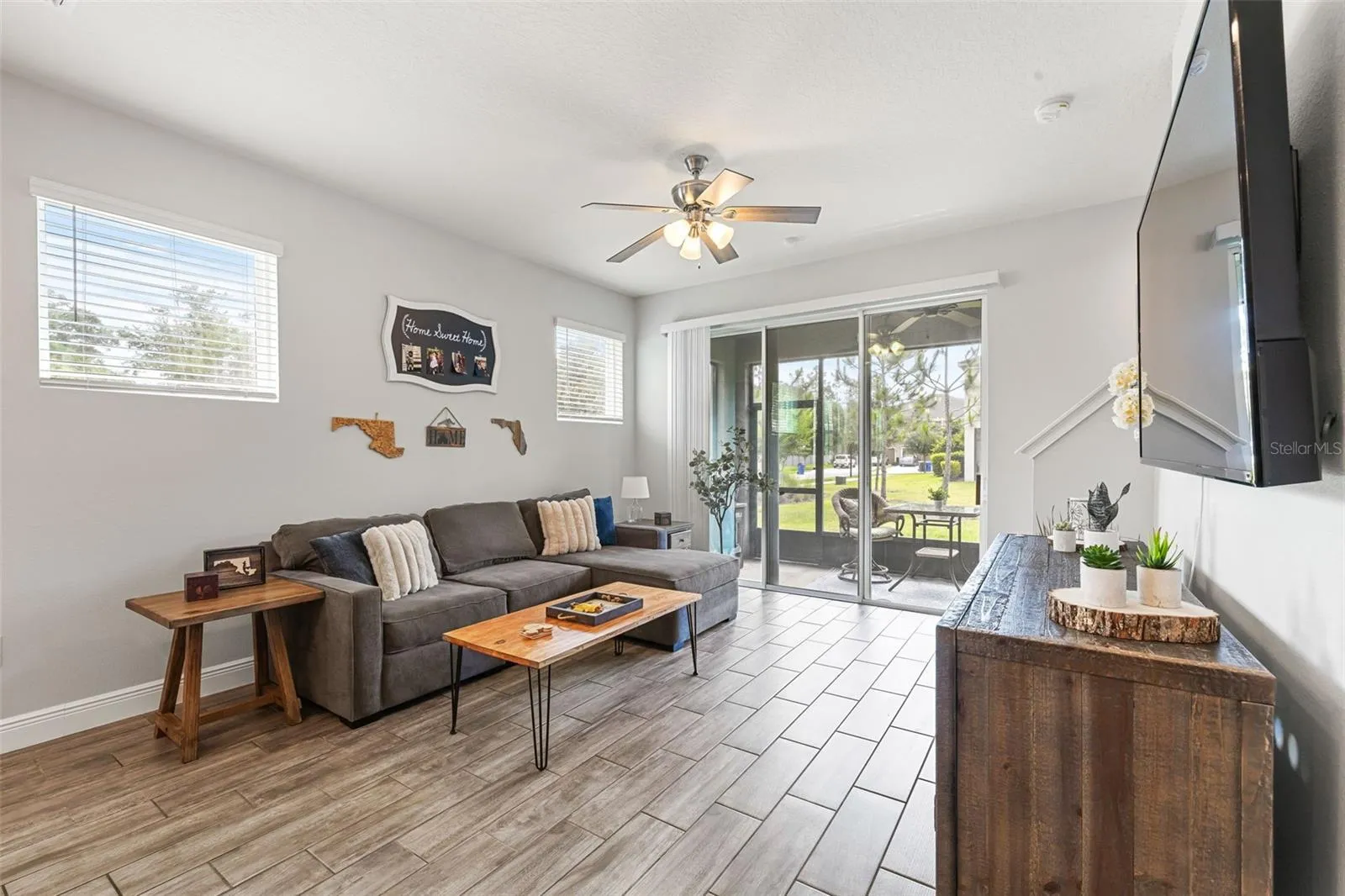 Step inside to find an open, light-filled layout with upgrades galore! Wood-look tile flooring spans throughout the first floor. The kitchen features an oversized island, quartz countertops, 42″ cabinets, stainless-steel appliances, and a walk-in pantry, making it the perfect space for cooking and entertaining. The screened back patio has a TV hook up and is the ideal spot for your morning cup of joe or an evening beverage.