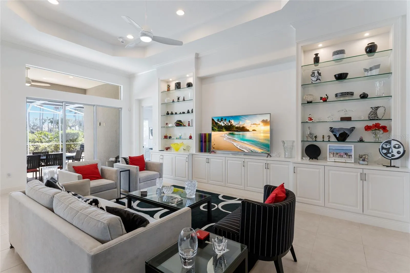 One of just 19 residents in LANSDOWNE CRESCENT – the newest single family neighborhood in University Park – this meticulously maintain Dorchester sits at the intersection of modern coastal architecture and refined Florida living. Built in 2015 the home presents like a model from the curb to the lanai, with professional landscaping, a courtyard-entry garage, and the kind of detail that signals pride of ownership at every turn. Step inside to soaring ceilings and crown molding throughout and open floor plan design for both everyday living and effortless entertaining. The great room anchors the home with custom built-ins and a tray ceiling, flowing into a separate dining room accented by a modern light stone feature wall, built-in cabinetry, and a wine refrigerator. The chef‘s kitchen delivers on every level – natural gas cooktop, double oven, stainless appliances, custom cabinetry, stone countertops, and a variegated tile backsplash surrounding a generous island. Just beyond, the morning room offers a quiet retreat with a direct pool view – the kind of space where a cappuccino and the morning paper become a daily ritual.