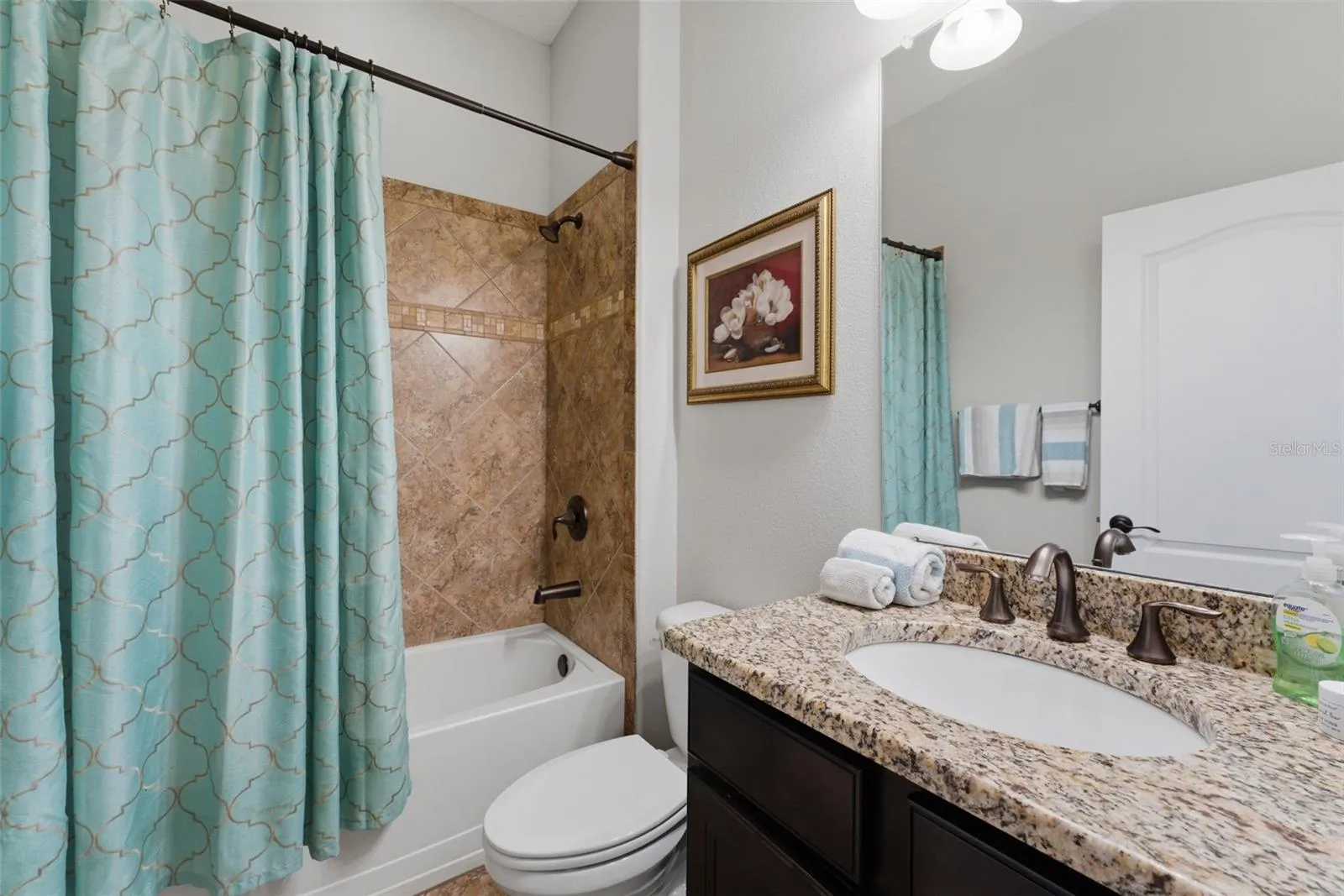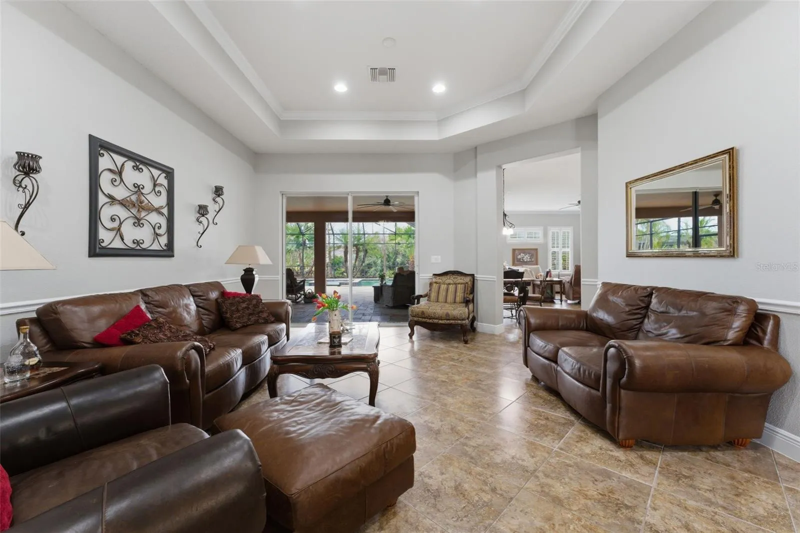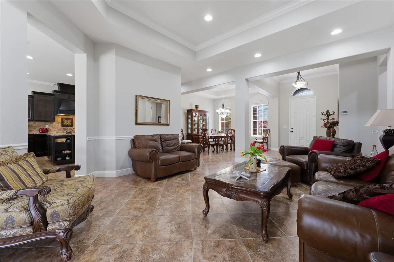One or more photo(s) has been virtually staged. Well-appointed and upscale , this casually elegant two-story Rye Wilderness home offers nearly 4,000 square feet of thoughtfully designed living space. The layout includes a versatile flex-suite that functions beautifully as a secondary primary bedroom, private guest quarters, or even an au pair unit. Step inside and let me walk you through a home that blends Mediterranean-inspired style with comfortable everyday living.As you enter, you’re greeted by an expansive, light-filled living area with a floor plan that introduces the formal dining room, main living room, and a welcoming hallway drawing you into the heart of the home. Generous windows and glass doors invite in soft natural light while preserving comfort, creating a bright, airy feel without harsh heat. Straight ahead, your eye is drawn to the lanai and pool, visible the moment you walk in, setting a relaxed tone.The classic masonry construction, elegant stone accents, and tile roof frame a warm interior centered around a fully equipped kitchen with an eat-in area perfect for daily meals. You’ll find ample cabinetry, a built-in pantry, double sink with disposal, and convenient access to the oversized family room. The large family room, anchored by another wall of sliding glass doors, opens to the lanai so you’re never far from tranquil views of the pool.