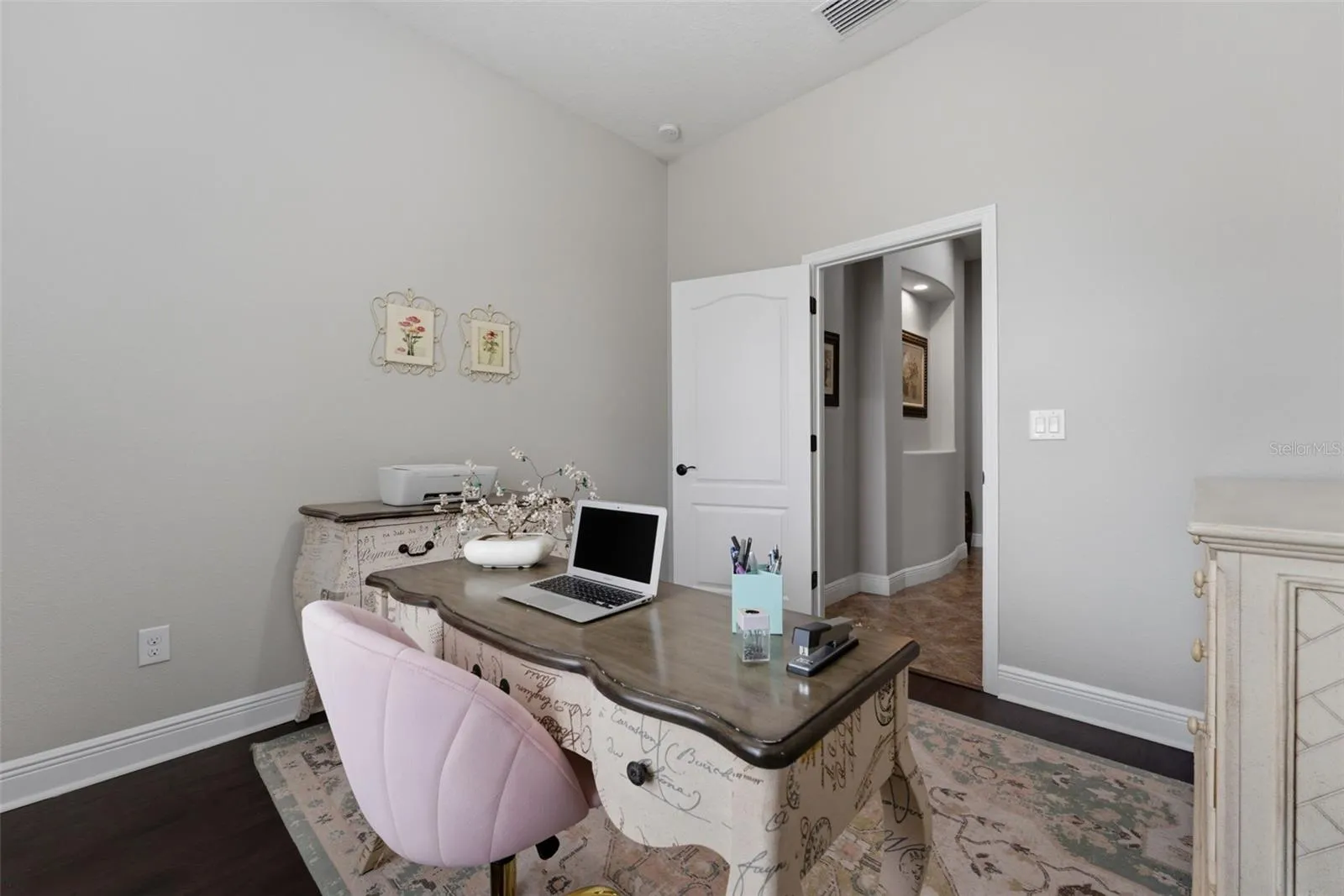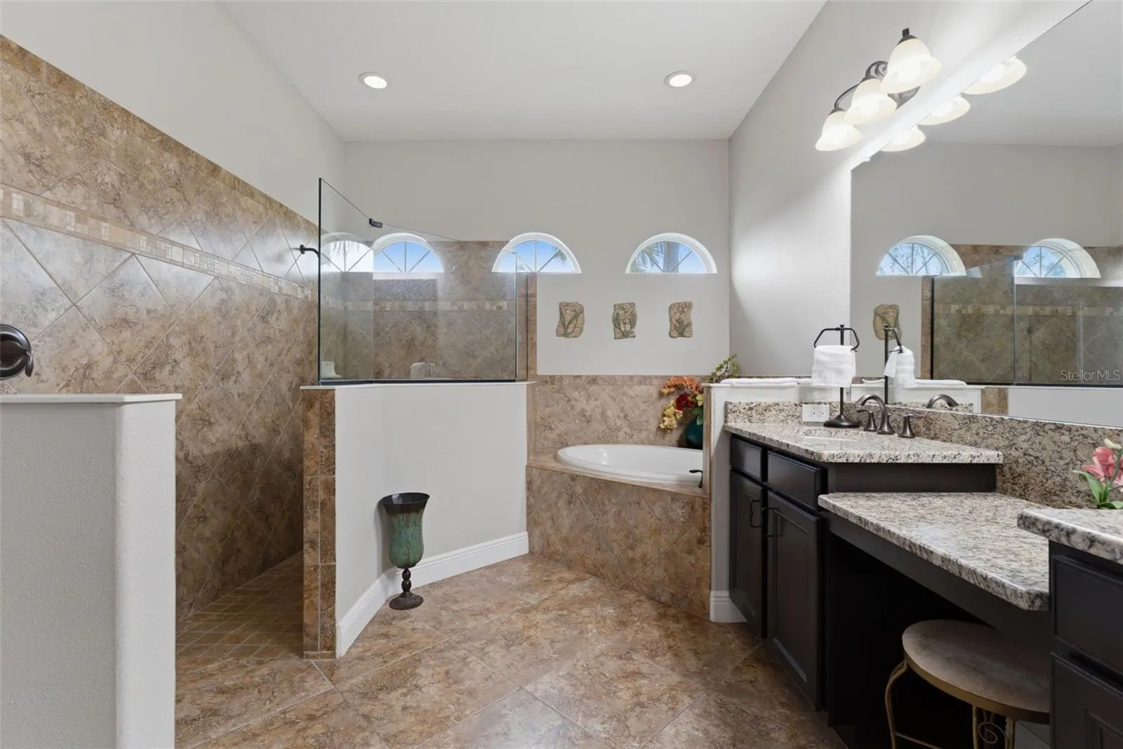At the opposite side of the main living spaces, a more private hallway transitions you into the owner’s wing. Just before the primary suite, a flexible room works beautifully as a nursery, office, sitting room, dressing room, or creative studio space. The primary bedroom is spacious and serene, and opens to the lanai and pool, allowing you to enjoy the water and waterfall feature. The primary bath offers a spa-like experience with a large walk-in shower, separate soaking tub, dual vanities, private water closet, and a generously sized walk-in closet.