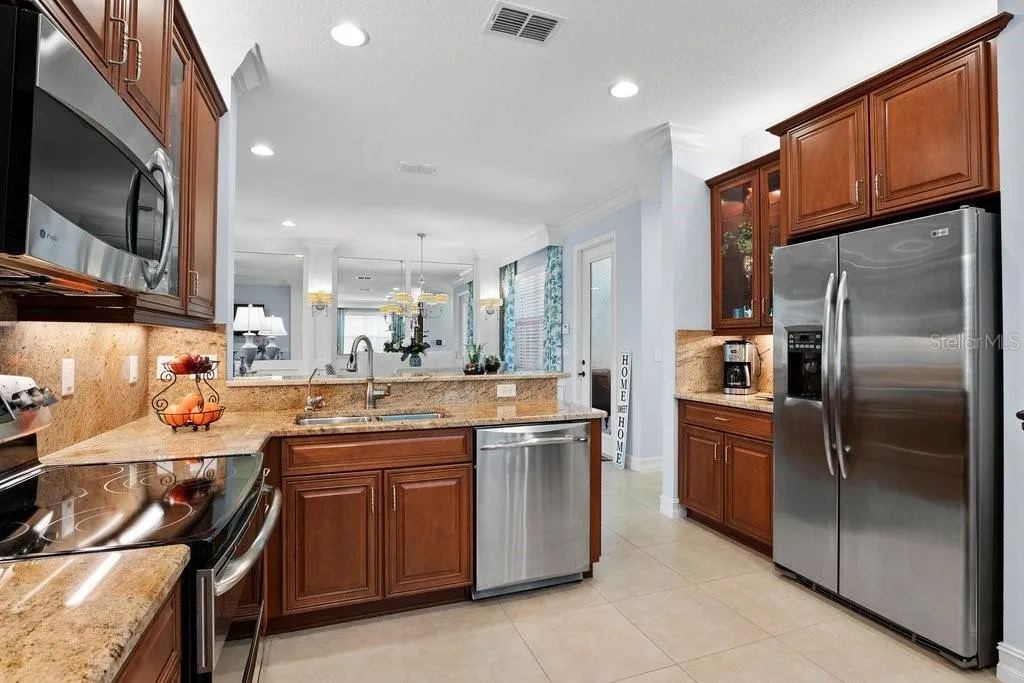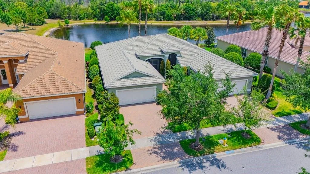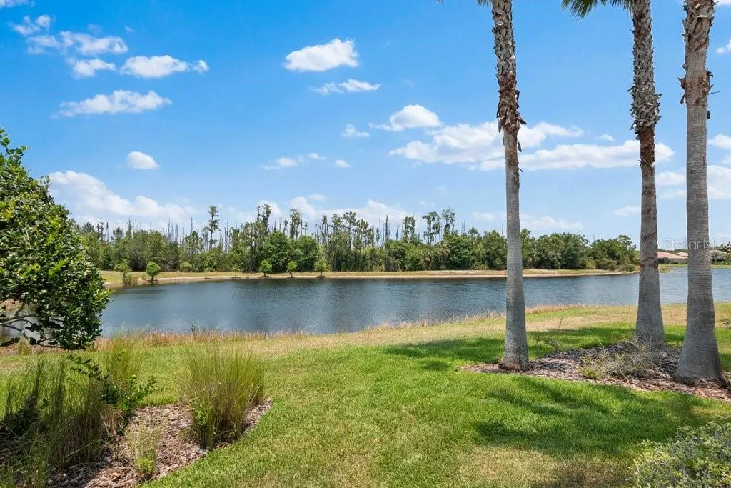 This “professionally decorated” model home located on a SPECTACULAR PANORAMIC WATER AND NATURE PRESERVE HOMESITE is being offered fully furnished!!! Enjoy watching the wildlife in their natural habitat with maximum back yard privacy, offering one of the most tranquil views within the Valencia Lakes resort-style 55+ community! This homeowner has been a part-time resident, so this home has been lightly used and is in immaculate condition. As you approach this well-maintained villa, you can’t help but notice the curb appeal provided by the gorgeous brick pavers, lush manicured landscape, and beautiful palm trees. The popular Cristina floorplan, 1321 sq. feet, offers 2 bedrooms, an informal dining room, 2 full baths and a 2-car garage. If you are looking for an open floor plan, this is the one. The kitchen is open to both the dining room and the large great room, which leads directly out to the screened/covered lanai with a brick paver extension. The ideal place to relax or entertain. The great room features a stunning custom built-in wall mirror with designer trim work and moldings that give the entire home an open and airy feel. The informal dining area also boasts a built-in wall mirror with designer molding and wall sconces. The eat-in gourmet kitchen features high-end 42″ raised panel maple cabinets with a glaze, upper/lower lighting w/ valance, glass doors and shelves with downlighting, custom granite counter tops, full granite backsplash, stainless steel appliances, cabinet pantry and more. The spacious primary-suite has a large walk-in closet, designer molding accent wall and private water/preserve view. The primary bath includes Corian countertops with dual integral sinks, custom framed mirror, upgraded maple cabinets w/ a glaze and a large walk-in shower with wall tile to the ceiling and designer mosaic accents. Bathroom#2 offers a bath/shower with tile surround and designer mosaic accents, maple cabinets with a glaze, custom framed mirror and Corian counters w/ extended banjo top. The laundry area includes a washer/dryer, built-in storage closet, plus some extra shelving for storage. This home has many upgraded features added such as: custom crown molding, 8′ decorative glass entry door, ceiling fans, recessed lighting, custom window treatments, blinds, designer wall paper, variable speed HVAC, water softener system, reverse osmosis in kitchen and accordion storm shutters and more. This spectacular home is in Valencia Lakes, Tampa Bay’s premier 55 plus Resort style community. Start enjoying the active lifestyle and the amazing amenities that Valencia Lakes has to offer. Feel like you are on vacation every day while experiencing resort style living featuring a 40,000 square foot clubhouse, pools, clubs, a bistro, art, fitness classes, pickle-ball, tennis, 24-hour fitness center, live shows and more. Start living the dream today!