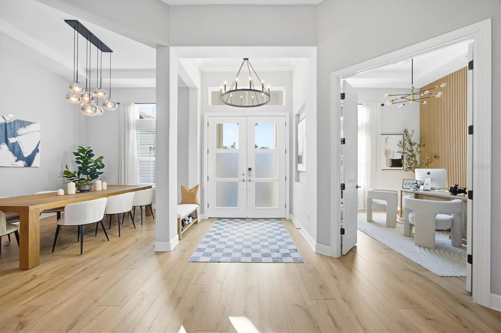This 4-bedroom, 4.5-bath home features 12-foot ceilings, tray details, luxury vinyl plank flooring, custom built-ins, and a gas fireplace. The open-concept great room flows into a chef’s kitchen with quartz countertops, upgraded cabinetry, stainless steel Samsung appliances, apron-front sink, and oversized island.