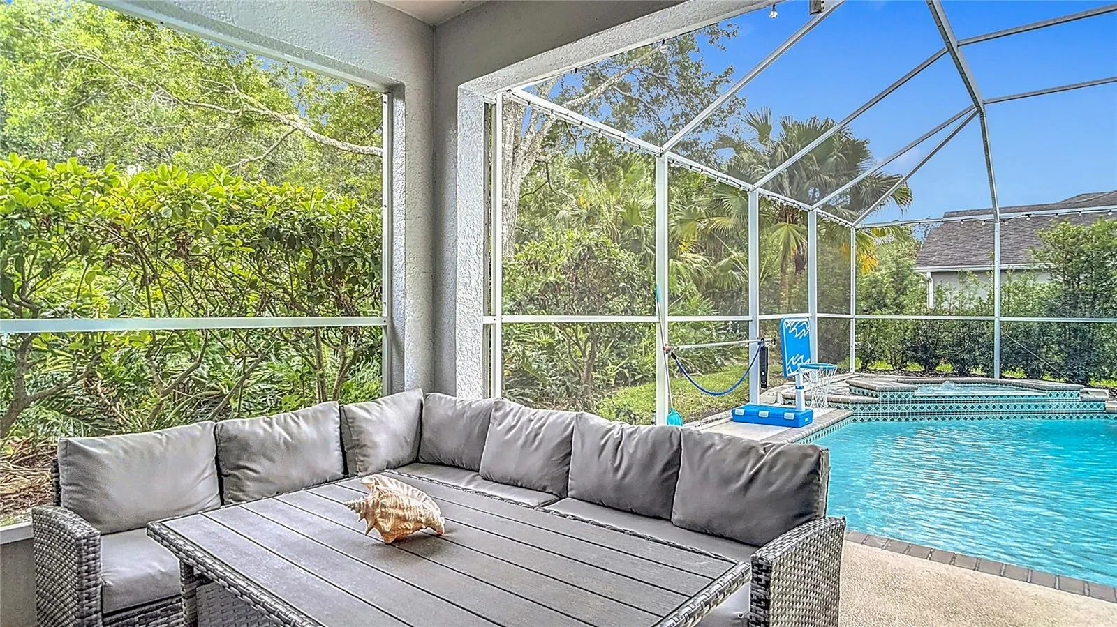 shelving, and a custom bookcase—perfect for remote work or study. Enjoy Florida living at its finest in the stunning outdoor space featuring a
