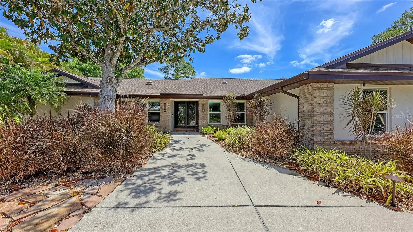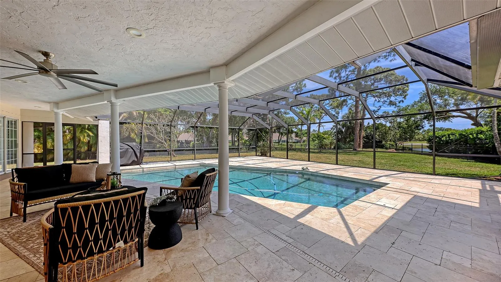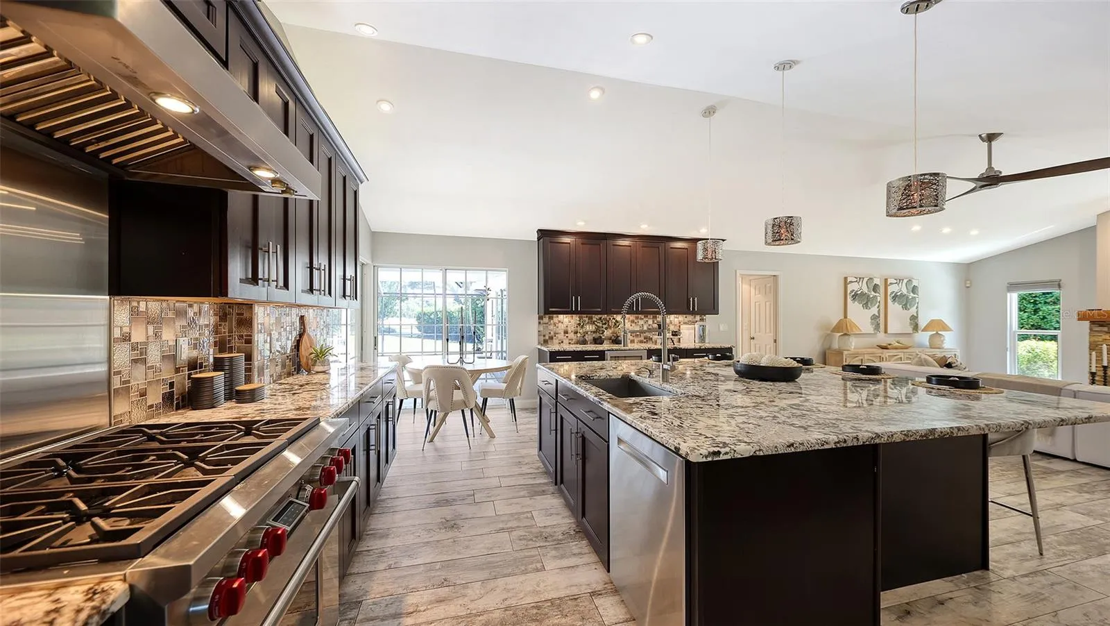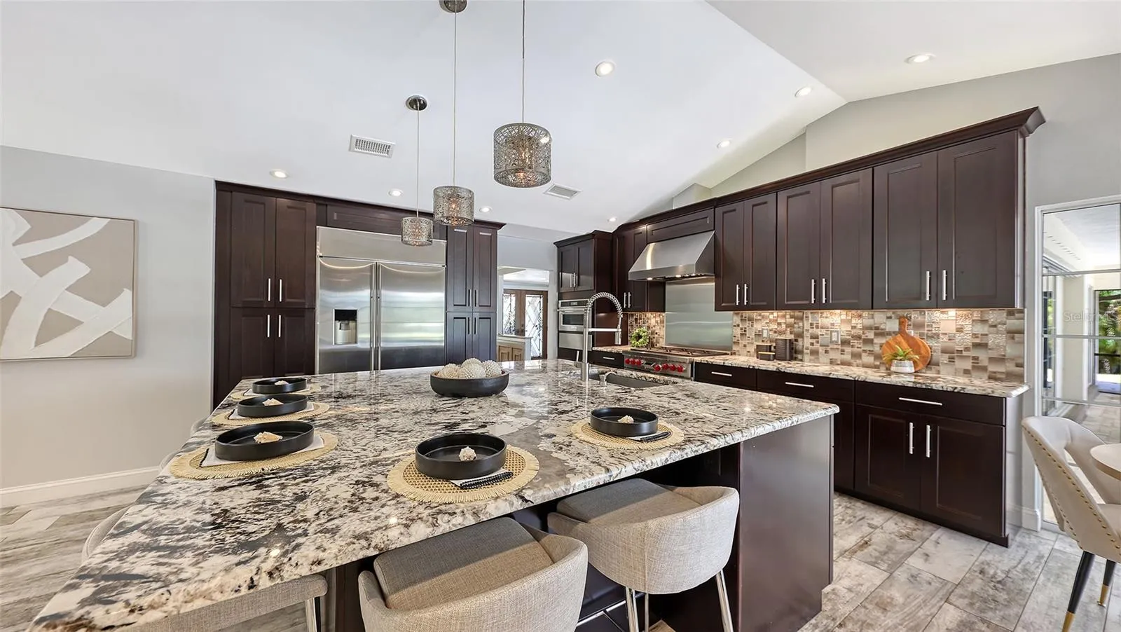 Under contract-accepting backup offers. Rare opportunity in Broadmoor Pines at Palm Aire Country Club. This beautifully renovated home sits on over ¾ of an acre at the end of a quiet cul-de-sac offering privacy, mature landscaping, and long water views with the 4th hole of the Lakes Course in the distance. Set deep off the road, this winding driveway and lush setting creates a striking arrival. New roof May 2025. Impact windows and a 3 car garage. The home is designed for comfortable everyday living and effortless entertaining, with porcelain plank tile flooring, crown molding, recessed lighting, upgraded ceiling fans and Hunter Douglas window treatments throughout. Gorgeous glass front doors open to formal living and dining spaces, while the open kitchen and family room form the heart of the home. The chef’s kitchen features premium appliances: Wolf dual-fuel 6-burner gas/convection range, GE Monogram refrigerator/freezer, KitchenAid built-in microwave, Bosch dishwasher, and Uline two-zone wine cooler. Custom dovetail cabinetry with pull-outs, pull-out pantry storage, granite countertops, mosaic tile backsplash, and under-cabinet lighting provide both style and functionality. A large dining island anchors the space and opens to an expansive family room with vaulted ceilings and a stone gas fireplace. The split-bedroom floor plan provides excellent privacy. The primary suite includes travertine flooring, plantation shutters, sliding doors to the lanai, and two custom walk-in closets. The updated bath offers dual granite vanities and a large walk-in shower with frameless glass and multiple shower heads, including dual rain showers. A flexible den with pocket doors and a closet can serve as a fourth bedroom, with access to a nearby half bath. The guest wing, tucked behind a pocket door, includes two spacious bedrooms and a full bath with direct pool access. This outdoor living is exceptional with a re-surfaced (heated) saltwater pool, travertine pavers, expansive covered bronze screened lanai, and fully fenced backyard. Located just 15 minutes from downtown Sarasota, Lido Beach, and Sarasota-Bradenton International Airport. Palm Aire Country Club offers 36 holes of golf with optional membership, plus tennis, pickleball, fitness, pools, and an active social calendar.