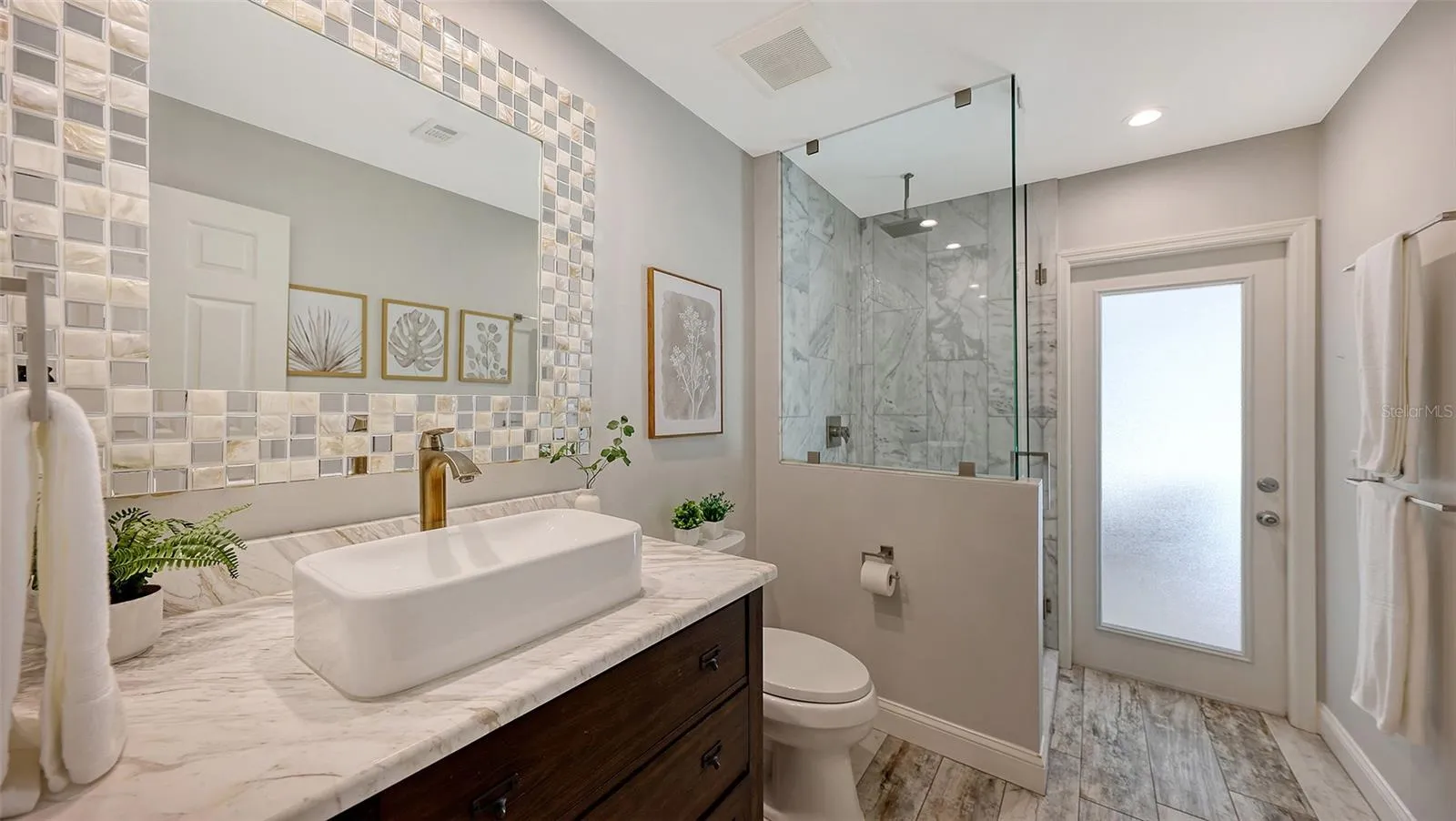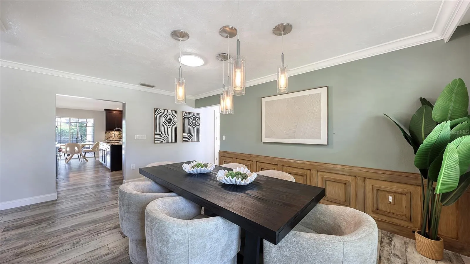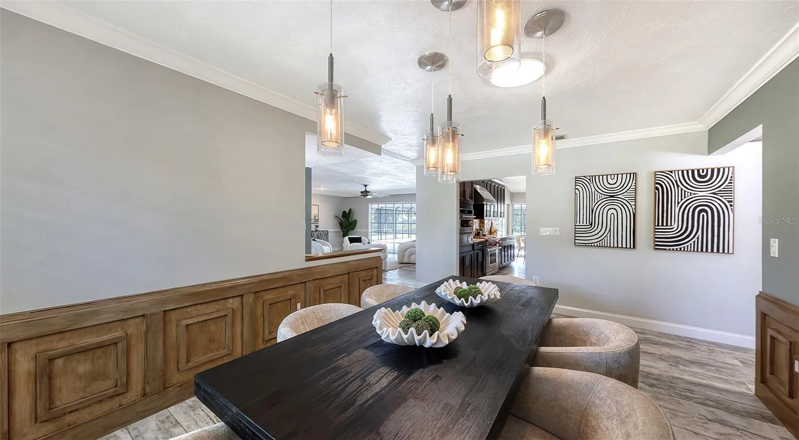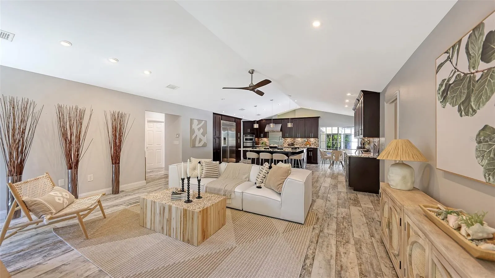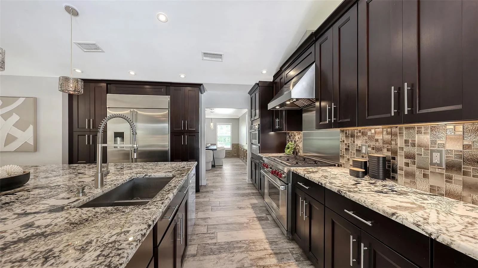 Under contract-accepting backup offers. Rare opportunity in Broadmoor Pines at Palm Aire Country Club. This beautifully renovated home sits on over ¾ of an acre at the end of a quiet cul-de-sac offering privacy, mature landscaping, and long water views with the 4th hole of the Lakes Course in the distance. Set deep off the road, this winding driveway and lush setting creates a striking arrival. New roof May 2025. Impact windows and a 3 car garage. The home is designed for comfortable everyday living and effortless entertaining, with porcelain plank tile flooring, crown molding, recessed lighting, upgraded ceiling fans and Hunter Douglas window treatments throughout. Gorgeous glass front doors open to formal living and dining spaces, while the open kitchen and family room form the heart of the home. The chef’s kitchen features premium appliances: Wolf dual-fuel 6-burner gas/convection range, GE Monogram refrigerator/freezer, KitchenAid built-in microwave, Bosch dishwasher, and Uline two-zone wine cooler. Custom dovetail cabinetry with pull-outs, pull-out pantry storage, granite countertops, mosaic tile backsplash, and under-cabinet lighting provide both style and functionality. A large dining island anchors the space and opens to an expansive family room with vaulted ceilings and a stone gas fireplace. The split-bedroom floor plan provides excellent privacy. The primary suite includes travertine flooring, plantation shutters, sliding doors to the lanai, and two custom walk-in closets. The updated bath offers dual granite vanities and a large walk-in shower with frameless glass and multiple shower heads, including dual rain showers. A flexible den with pocket doors and a closet can serve as a fourth bedroom, with access to a nearby half bath. The guest wing, tucked behind a pocket door, includes two spacious bedrooms and a full bath with direct pool access. This outdoor living is exceptional with a re-surfaced (heated) saltwater pool, travertine pavers, expansive covered bronze screened lanai, and fully fenced backyard. Located just 15 minutes from downtown Sarasota, Lido Beach, and Sarasota-Bradenton International Airport. Palm Aire Country Club offers 36 holes of golf with optional membership, plus tennis, pickleball, fitness, pools, and an active social calendar.