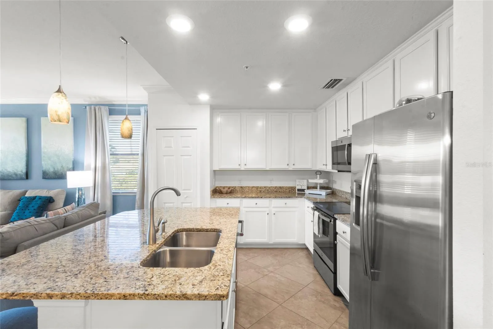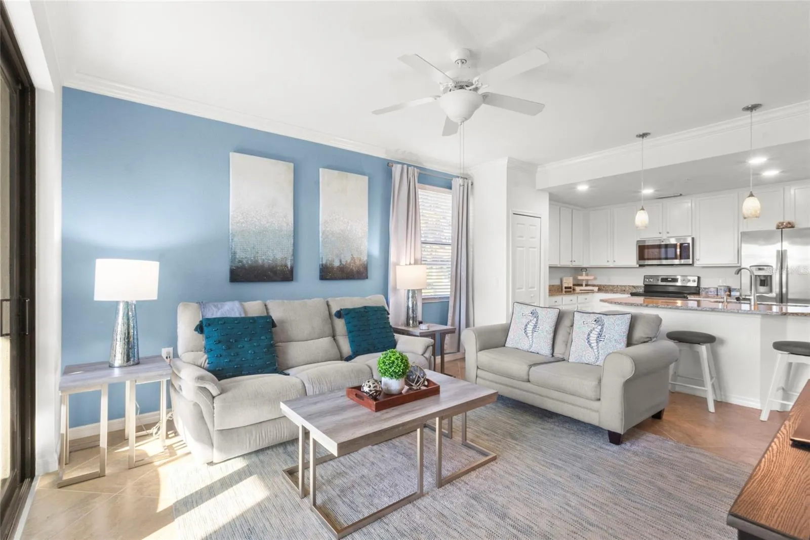 Inside, the home has been thoughtfully updated with luxury vinyl flooring in all bedrooms, creating a clean, modern look with durability and style. The kitchen features refreshed cabinetry that brightens the space while complementing the open layout. The living and dining areas flow naturally to the lanai, maximizing the water and golf course views and creating the indoor-outdoor lifestyle Florida buyers crave. The residence is being offered with tastefully selected furnishings that create a fun, clean coastal vibe, enhancing the light and airy feel and allowing for a truly turnkey opportunity. Being a first-floor unit adds convenience and accessibility, making everyday living simple and comfortable.