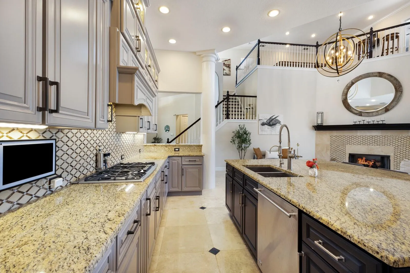 Inside, travertine flooring, cathedral ceilings, and expansive windows and sliders fill the home with natural light. The chef’s kitchen is equipped with custom cabinetry featuring glass display panels, stainless-steel appliances, granite countertops, and a center island with seating. The adjoining family room flows seamlessly to the outdoor living area, extending the home’s livable space by more than 1,200 square feet.
