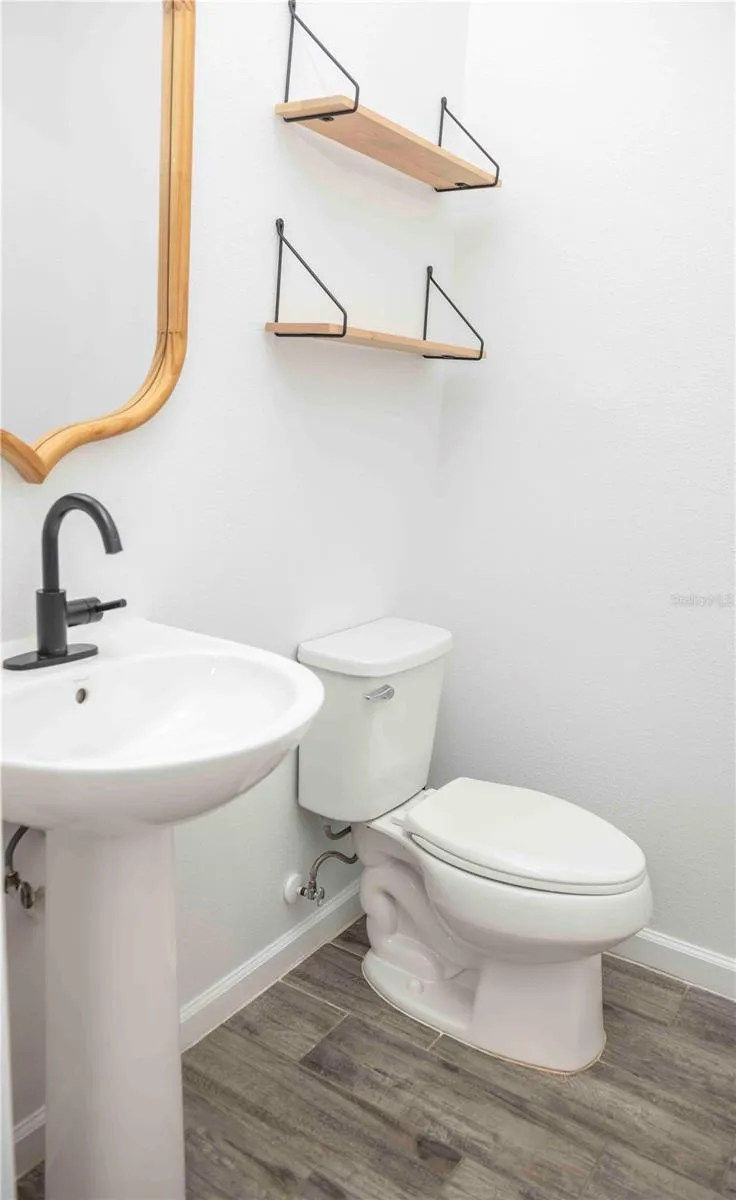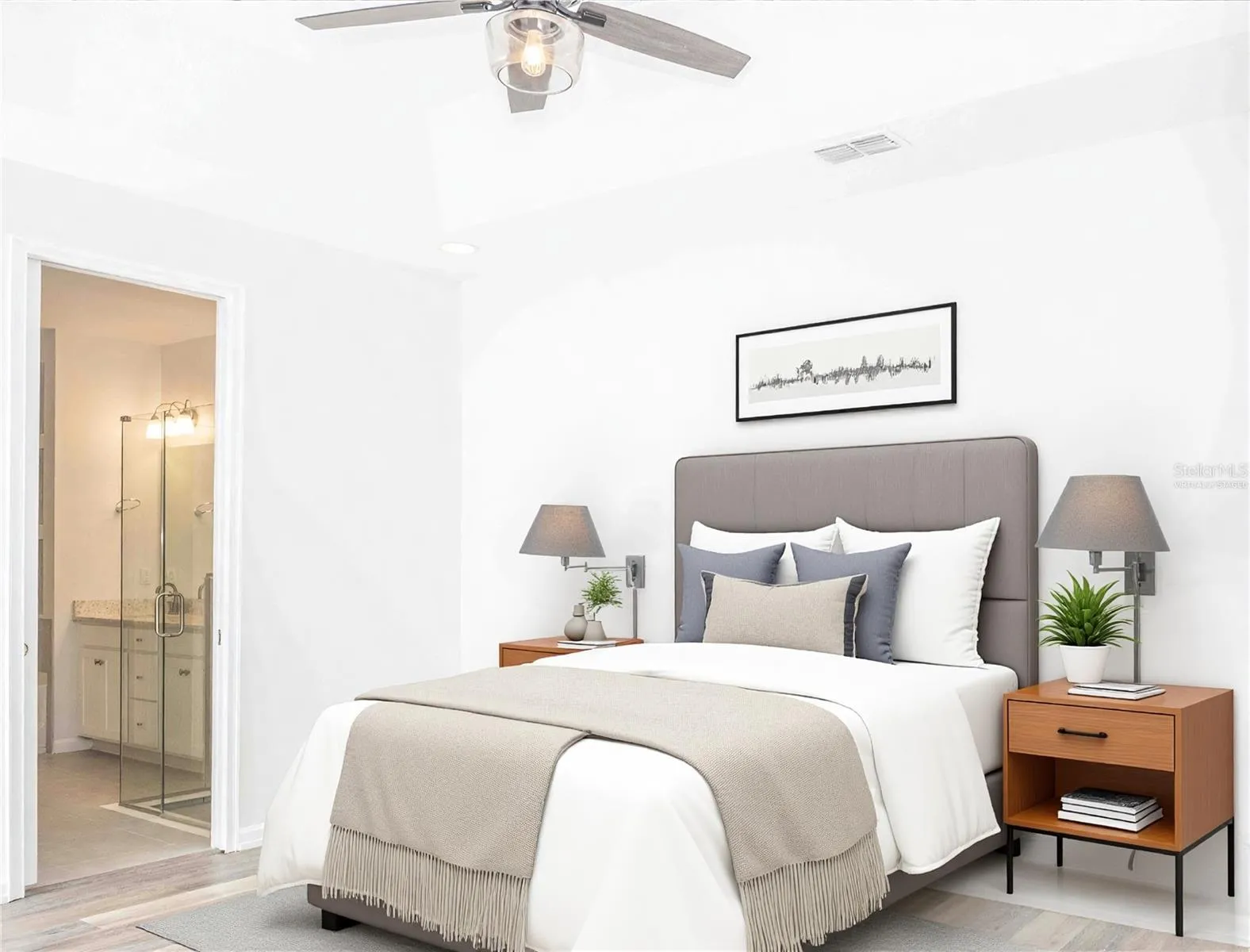 The first-floor primary suite offers privacy and comfort, complete with luxury vinyl plank flooring, a large walk-in closet, and a spa-inspired bath featuring dual granite vanities, an extended tiled shower, and a relaxing soaking tub. The laundry room is also conveniently located on the first floor.