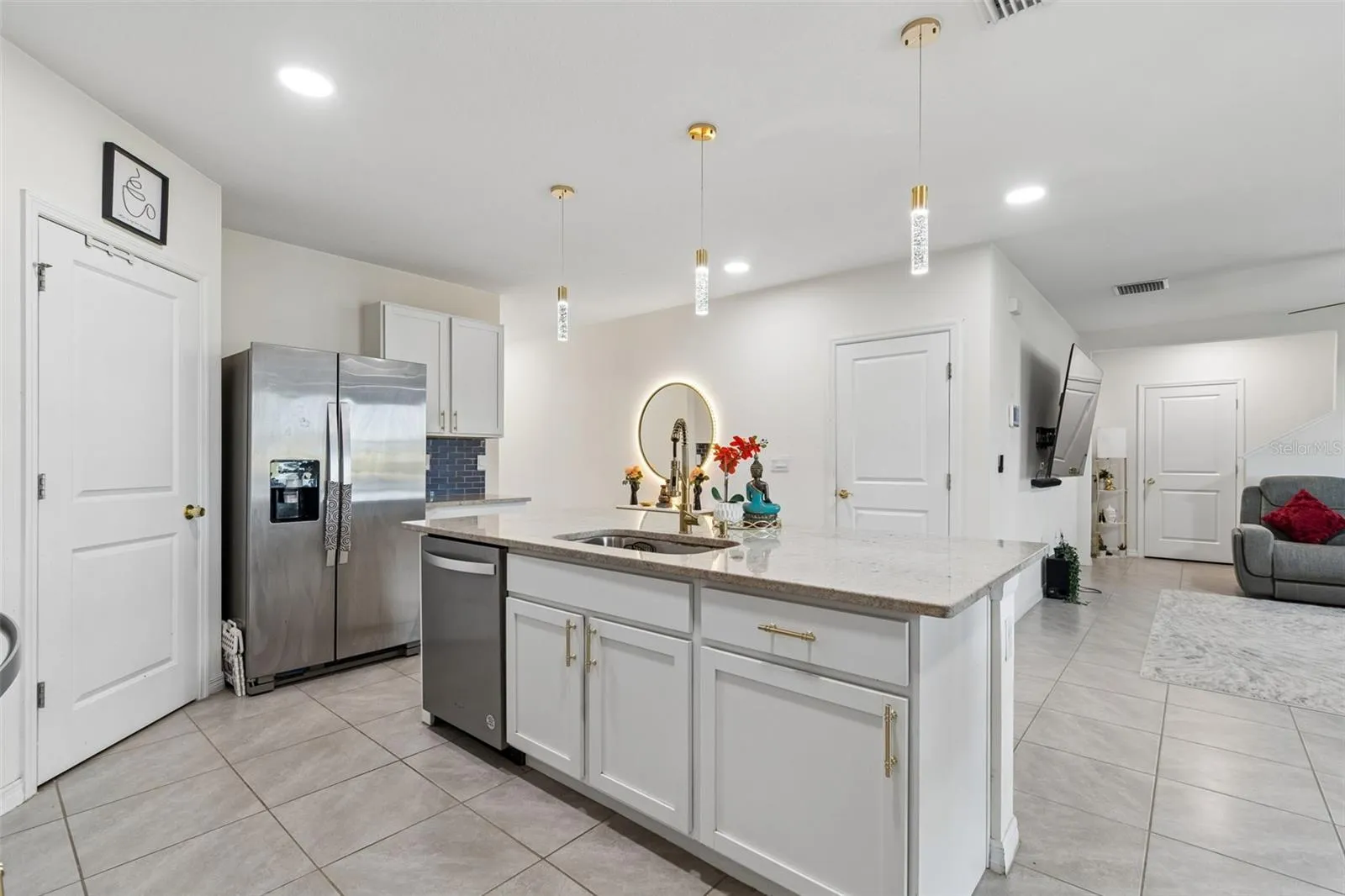Welcome to this beautifully maintained, modern home located in the heart of Wesley Chapel! Offering 2,372 square feet of thoughtfully designed living space, this home blends style, comfort, and functionality. Featuring 4 bedrooms, 3 full bathrooms, and an upstairs loft, this spacious layout provides plenty of room for both everyday living and entertaining. The heart of the home showcases an open-concept kitchen with tile backsplash and stone countertops, dining, and living area, creating the perfect space to gather with family and guests. The first floor includes a versatile bedroom that can easily serve as a home office or den, along with a full bathroom featuring both a tub and shower—ideal for guests or multi-generational living. Upstairs, you’ll find the spacious primary suite complete with a large walk-in closet and a private en-suite bathroom. The second floor also offers an oversized loft with peaceful pond views, two additional bedrooms, another full bathroom, and a conveniently located laundry room. Step outside and unwind in your own private outdoor retreat. The extended screened-in lanai features a large panoramic screen, providing beautiful views of the pond and conservation area. With ample shade and space, the enclosed patio is perfect for enjoying Florida living year-round. Additional highlights include a 2-car garage with an upgraded epoxy floor and extra-large overhead storage racks for added convenience. Ideally located just off State Road 56, this home offers quick access to shopping, dining, and medical facilities. Schedule your private showing today and don’t miss an opportunity to view this wonderful home!