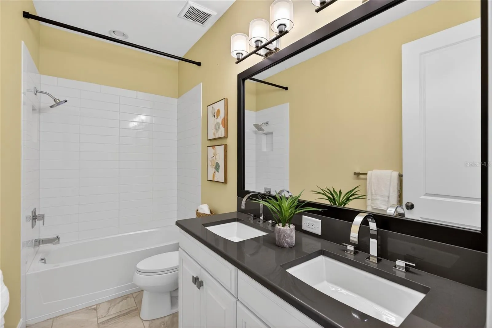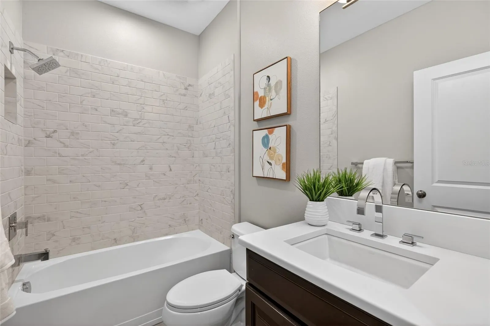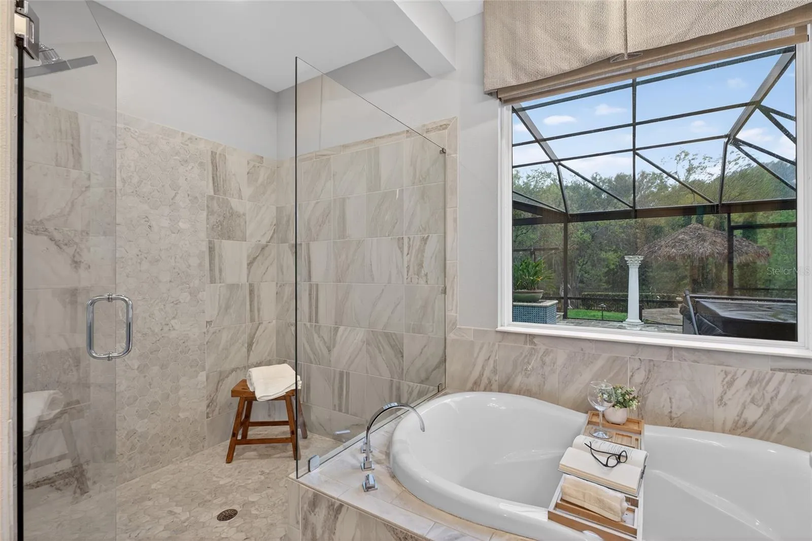 Behind the gated entrance of The Enclave at Meadow Pointe, this striking residence makes a memorable first impression with its dramatic stone façade, refined architectural detailing, and beautifully landscaped approach. A paver sidewalk and driveway lead to an oversized three-car garage accented with coach lights, while the front elevation displays decorative banding and architectural corbels that reflect the home’s craftsmanship. A covered portico with a urethane sapele wood ceiling frames the grand entry. Built in 2016 by Standard Pacific as a showcase design, this two-story home offers 3,467 square feet with five bedrooms and four bathrooms. The front yard features natural flagstone landscaping accented by fresh mulch beds, exterior ground lighting, and a classic fountain centerpiece that enhances the home’s curb appeal. Flagstone pathways extend along both sides of the home, guiding you toward the gated and fenced backyard. The outdoor living space is designed as a private resort-style retreat, featuring a screen-enclosed Roman-style pool with wide entry steps, a spacious sundeck with integrated fountain features, and large decorative planters. A raised spa with a dramatic three-tier spillover overlooks the pool, while the travertine lanai and pool deck create an elegant entertaining space. An above-ground Michael Phelps hot tub on the expansive lanai provides additional relaxation and hydrotherapy. Beyond the screen enclosure, the backyard continues with a tiered step-down to a round patio with built-in circular seating, firepit, and a charming thatched tiki hut. Surrounded by lush greenery, garden statues, a playset, and open green space, the fully fenced yard offers a private setting for relaxation and recreation. Step through the double leaded glass entry doors into a beautifully appointed interior freshly painted in 2026, where soaring ceilings, 7-skylights, recessed lighting, crown molding, and ceramic tile flooring enhance the home’s bright and open feel. Custom-designed closet systems are found throughout the bedrooms and hallways. Just off the foyer is a versatile office, den, or fourth bedroom with a nearby full bath, while the formal dining room features a painted brick accent wall. The home opens to a spacious kitchen and great room designed for everyday living and entertaining, with Quartz countertops, glass display cabinetry, and a basket-weave backsplash, along with new 2025 Thermador appliances including an induction cooktop, French-door refrigerator, built-in microwave, and convection oven. A breakfast bar, butler’s pantry, and casual dining area with sliding doors to the lanai complete the space. The primary suite offers a private retreat with a tray ceiling and a custom designed walk-in closet. The spa-inspired ensuite bath includes a soaking tub, a tiled walk-in shower with seamless glass enclosure, and a retractable shade for privacy and natural light control. An adjoining flexible room offers exceptional versatility as a nursery, fitness room, office, or private sitting area. Upstairs, a large bonus room with built-in speakers and a kitchenette is joined by a fifth bedroom and full bath, creating an ideal guest or in-law suite. Ideally located in the heart of Wesley Chapel near The Shops at Wiregrass, Tampa Premium Outlets, hospitals, top-rated schools, dining, and entertainment, with easy access to SR-56 and I-75. A rare opportunity to enjoy elegant indoor living paired with exceptional outdoor space.